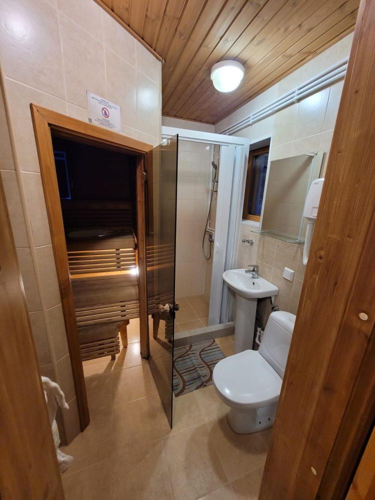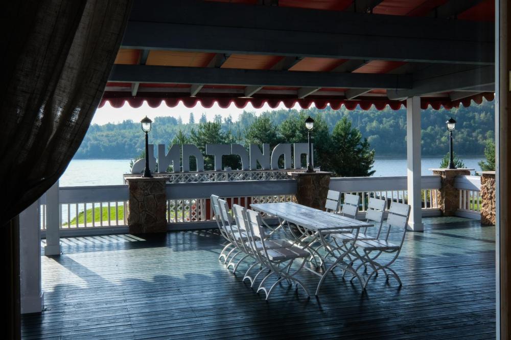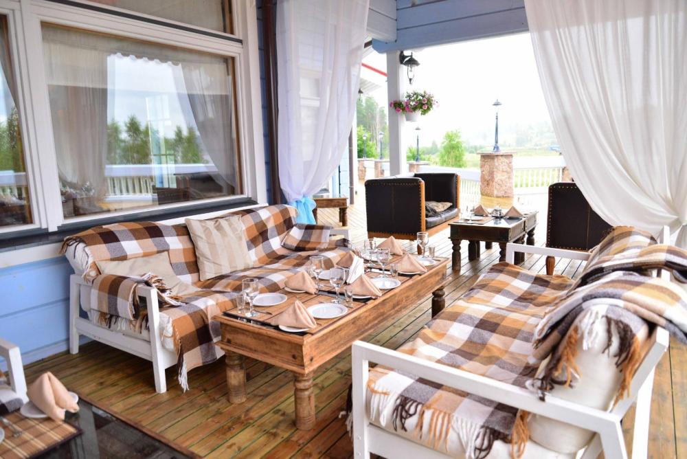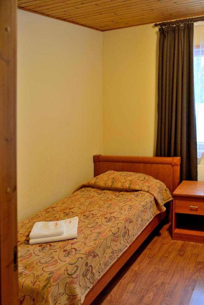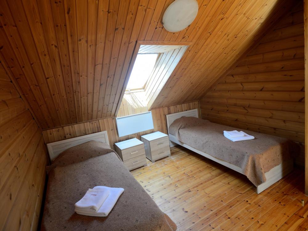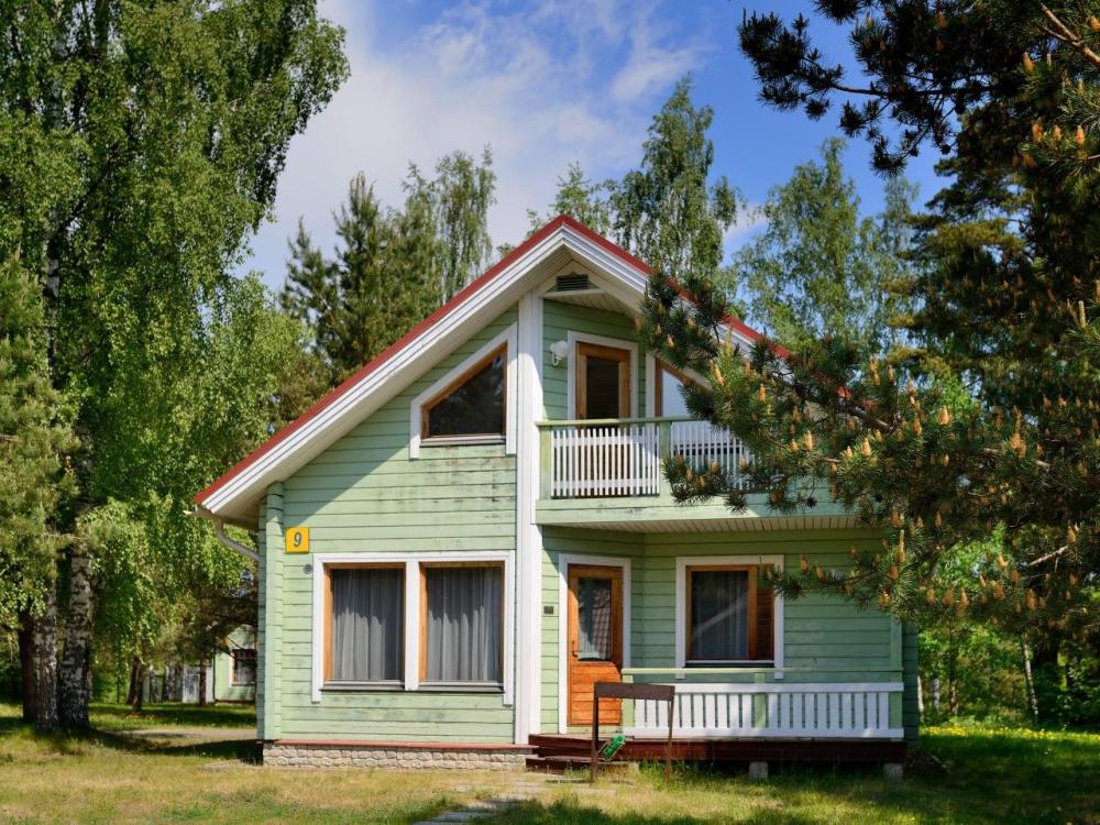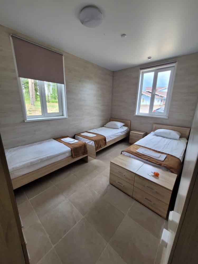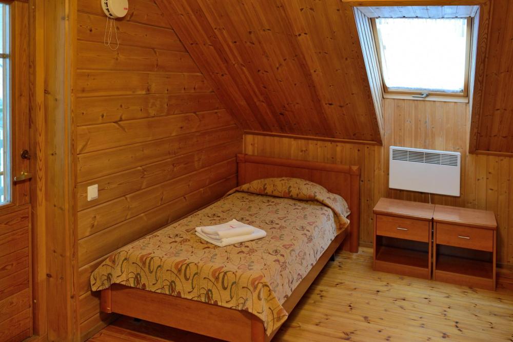 Коттедж Сосна общей площадью 96 кв.м для размещения до 6-ти гостей (4 основных места, 2 дополнительных места). Первый этаж: гостиная с камином, спальня с двумя односпальными кроватями, сауна, кухня - столовая, санузел, душ; Второй этаж: холл с мягкой мебелью, одна спальня с двумя односпальными кроватями или двухспальной кроватью.