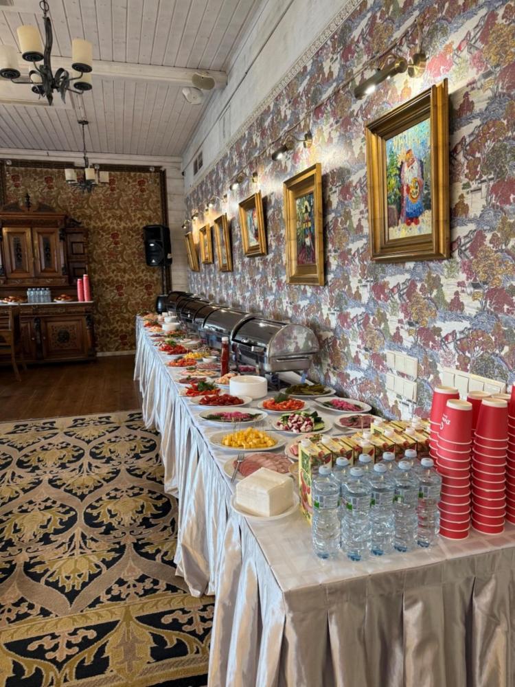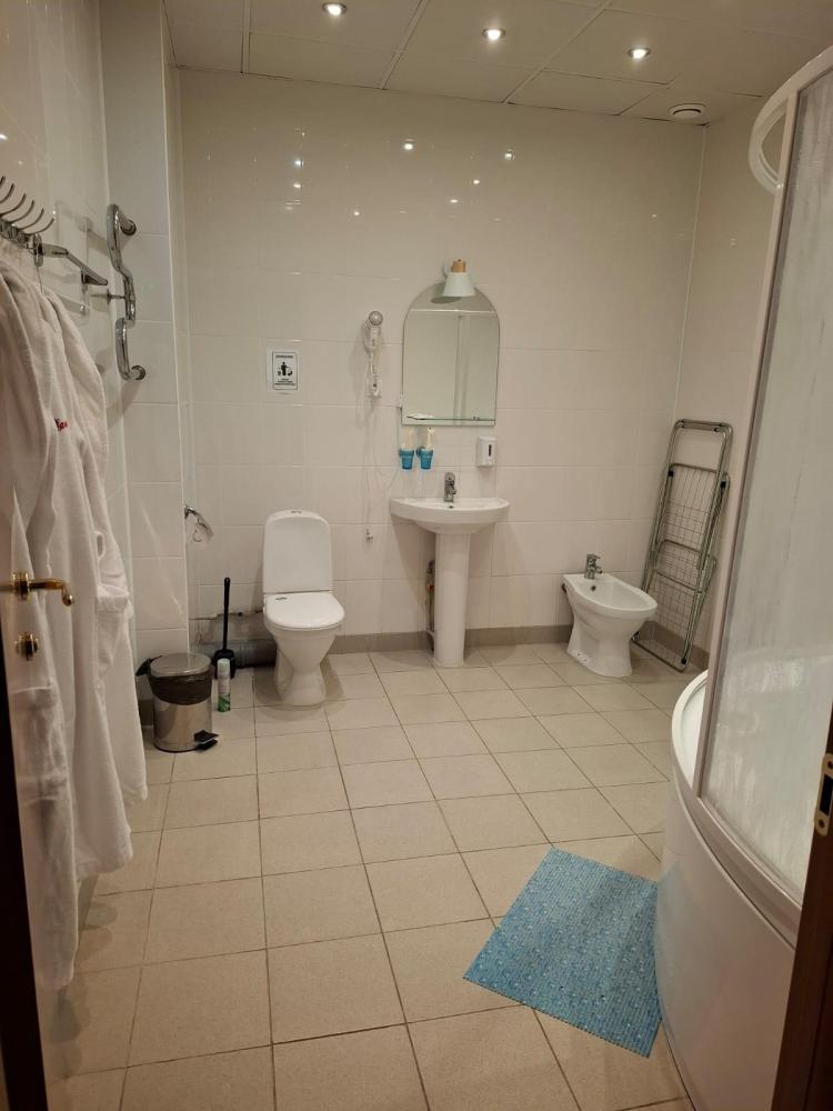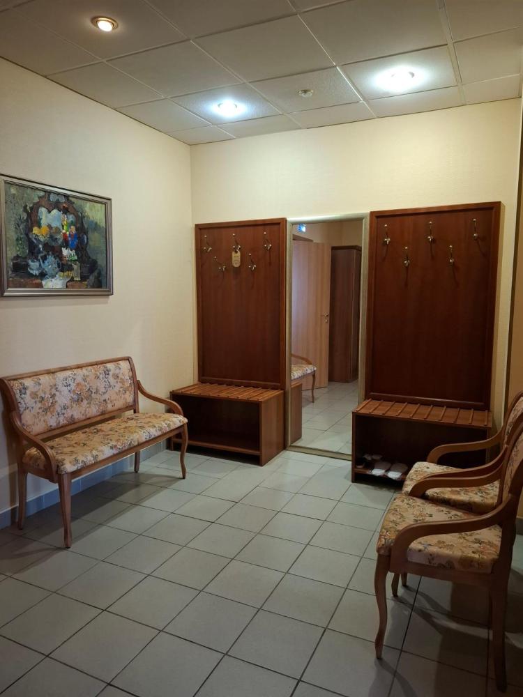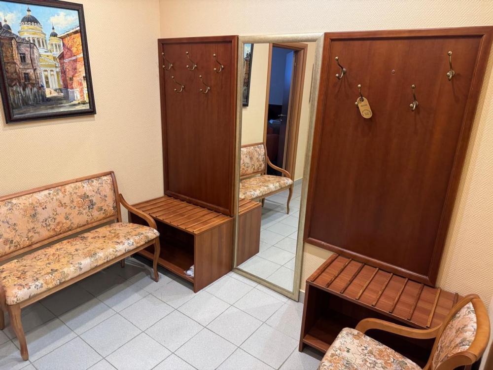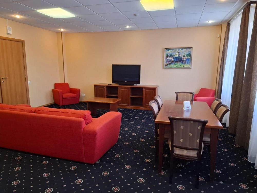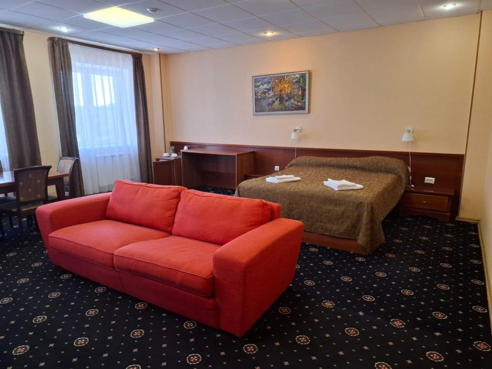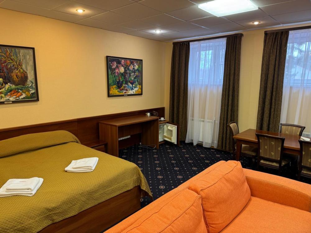Двухестный номер люкс общей площадью 53 кв.м. В номере: двуспальная кровать, диван, 2 кресла, прихожая, шифоньер, плазменный телевизор, стол, стулья, письменный стол, тумбочки, санузел, электрочайник, чайная посуда, кувшин и стаканы для воды, мини-холодильник.