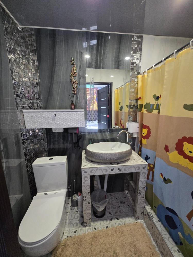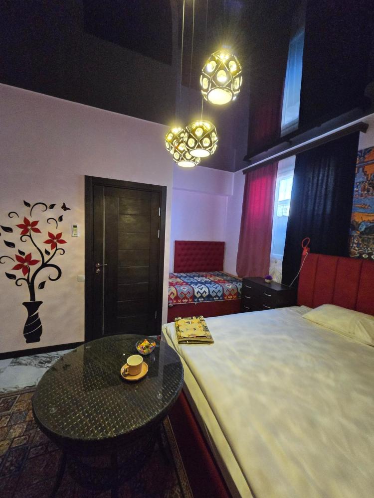 ✨ Этот номер — идеальное решение для семьи или пары с ребёнком. Просторная кровать King-size Большая двухместная кровать с мягким красным изголовьем подарит полноценный отдых и уютные ночи. Дополняет атмосферу стильный диванчик и мягкое освещение, создающее ощущение уюта. Дополнительное спальное место В номере предусмотрена отдельная кровать для ребёнка, расположенная у окна и украшенная текстилем с национальным орнаментом — это практично и удобно для семейного отдыха. Уютный интерьер Декор в восточном стиле с ковровыми узорами и настенным панно создаёт тёплую атмосферу. На полу — мягкий ковёр, идеально подходящий для домашнего уюта. Современная ванная Ванная комната оформлена в стильных чёрно-белых тонах. Гостей ждёт удобная душевая кабина с гидромассажной панелью, умывальник с декоративным зеркалом и все необходимые удобства. Для комфорта — Кондиционер — Бесплатный Wi-Fi — Зона отдыха с чайным столиком — Атмосферное освещение Этот номер подойдёт как для романтической поездки, так и для семейного отдыха с детьми, сочетая простор, уют и стильный дизайн.