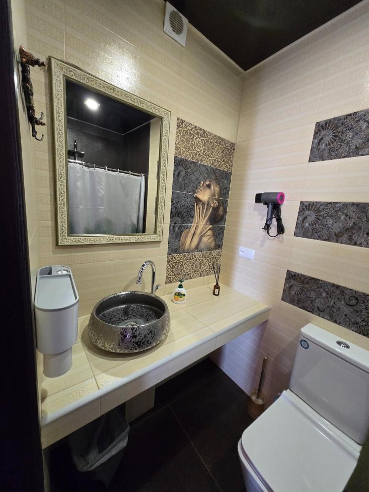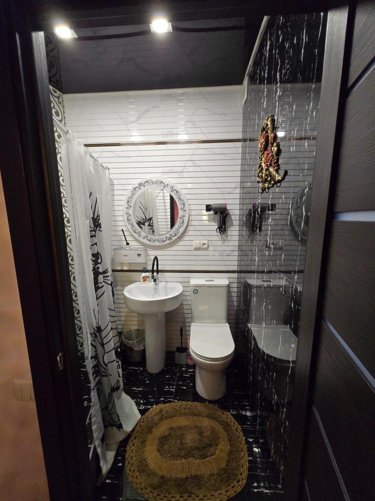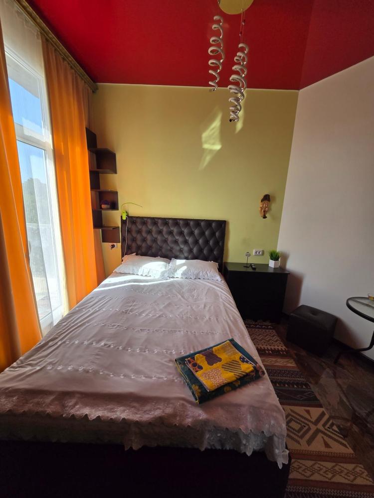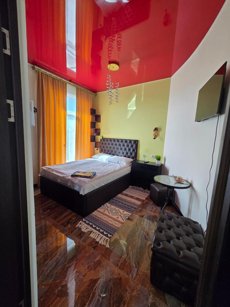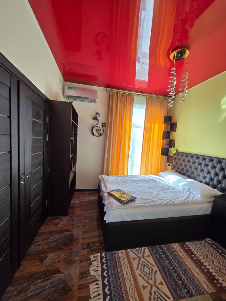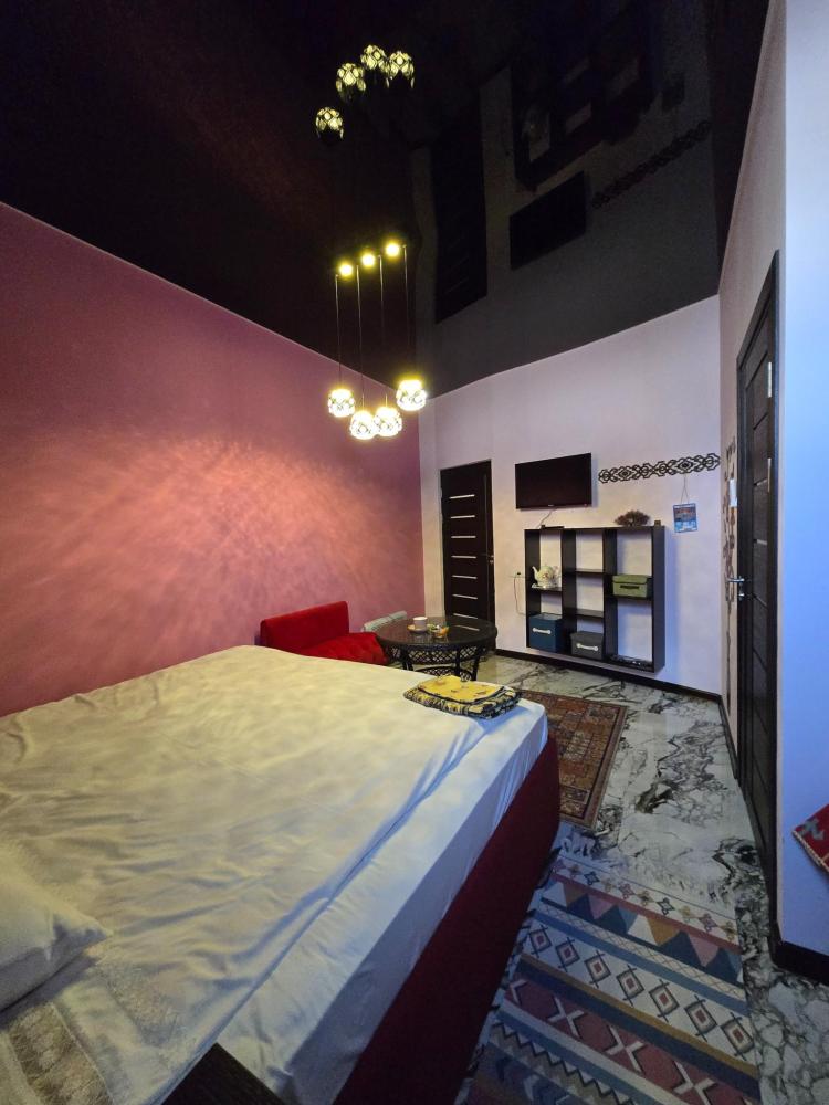 ✨ Спальня Просторная кровать с мягким изголовьем подарит комфортный сон. Большое окно с золотистыми шторами наполняет комнату светом и создаёт настроение утреннего пробуждения. Для отдыха и удобства — небольшой столик с креслом и пуфик. Современный телевизор — для уютных вечеров в номере. Атмосферный глянцевый потолок в красных тонах делает интерьер ярким и необычным. Ванная комната Стильная раковина «золотая чаша» добавляет изысканности. Фен, зеркало и всё необходимое для комфорта. Этот номер — не просто место для сна, уютный, стильный . Идеален для пары, друзей или путешественников, которые хотят отдохнуть с комфортом и улыбкой.