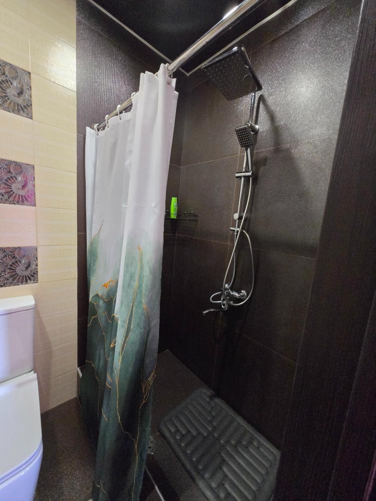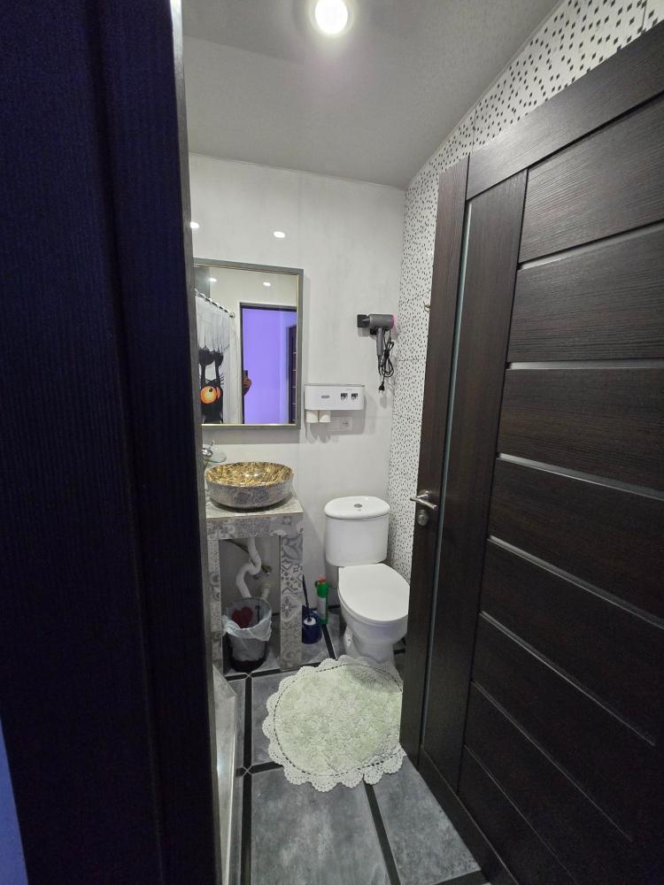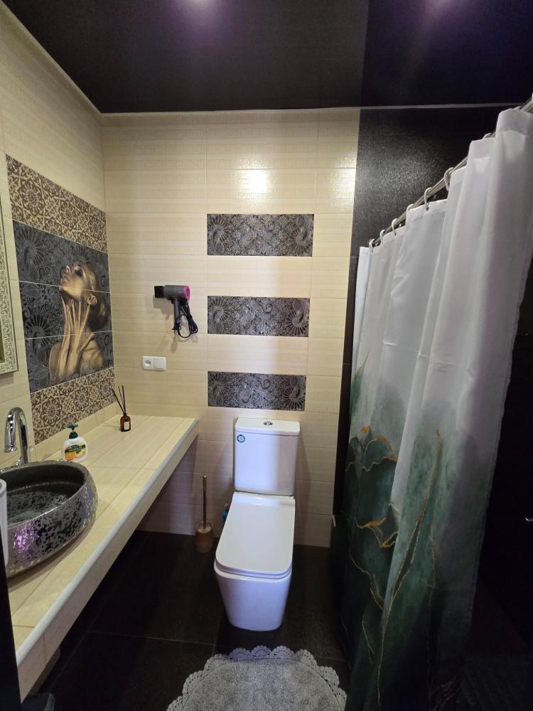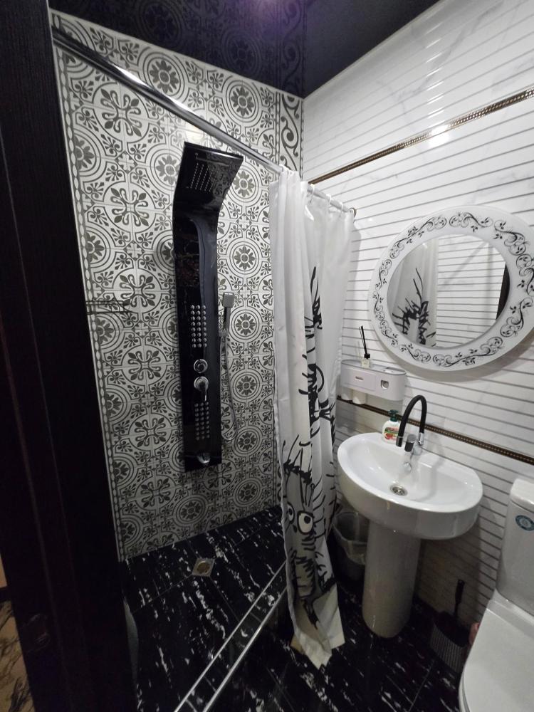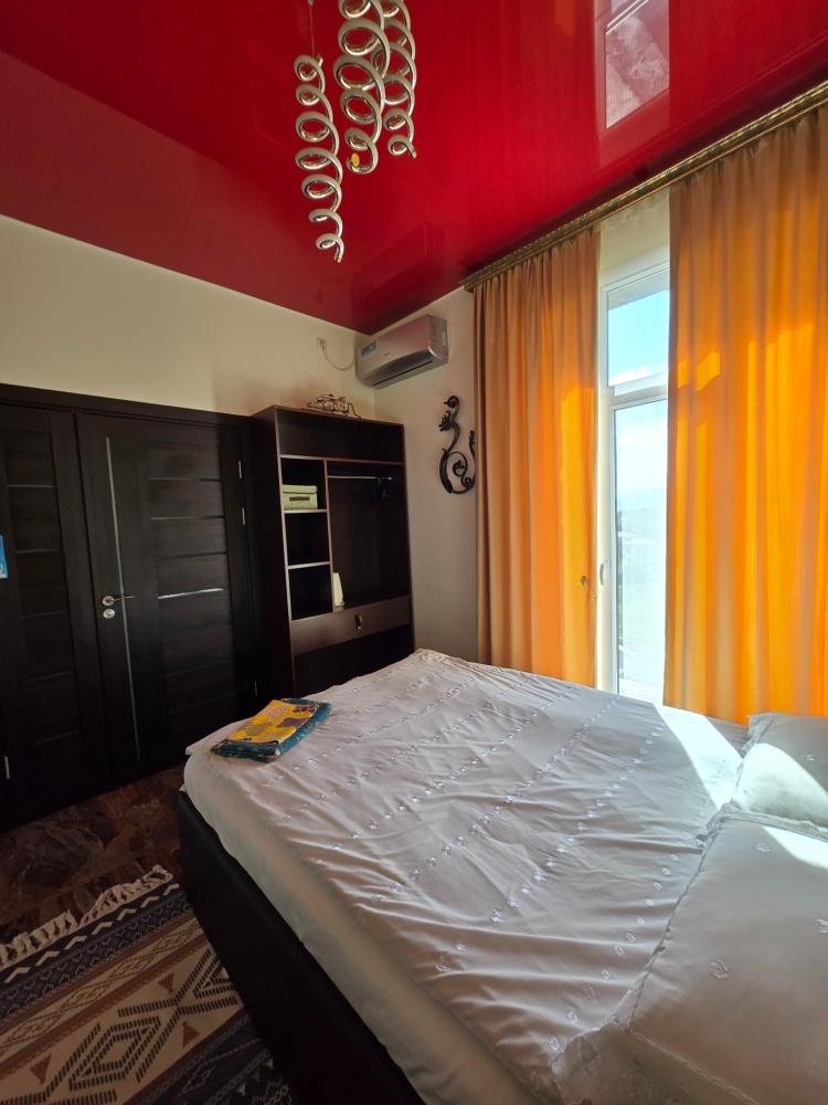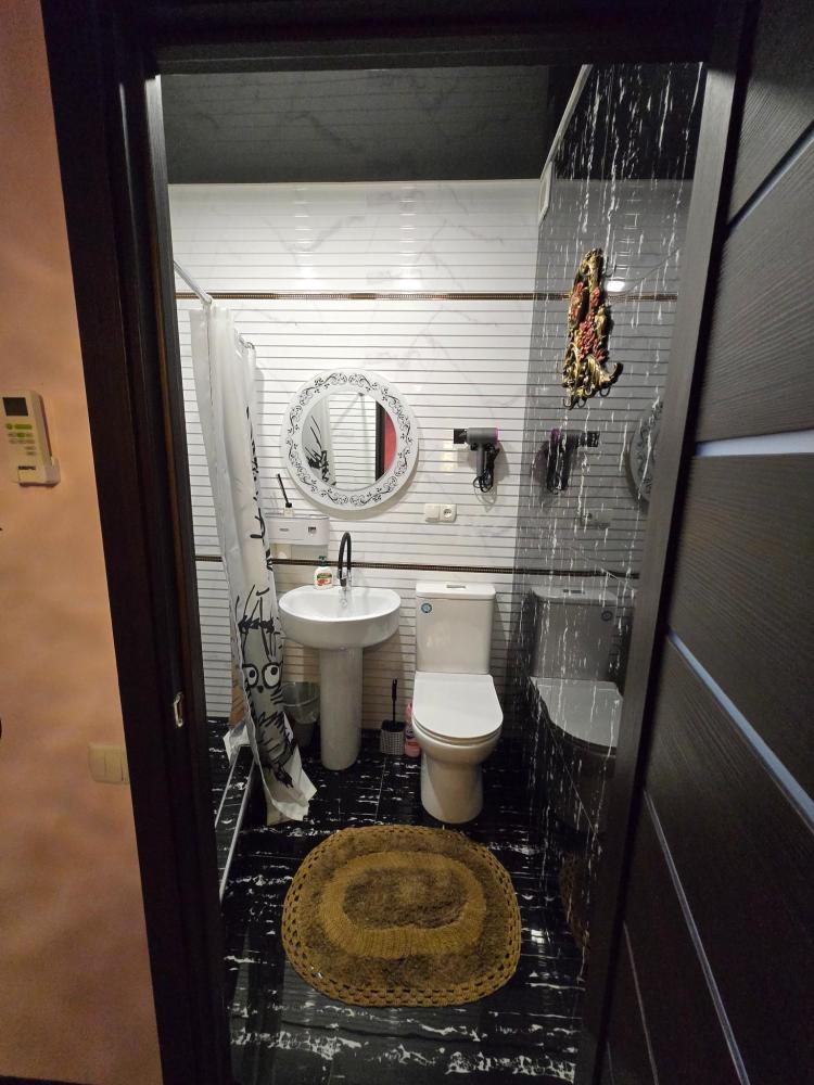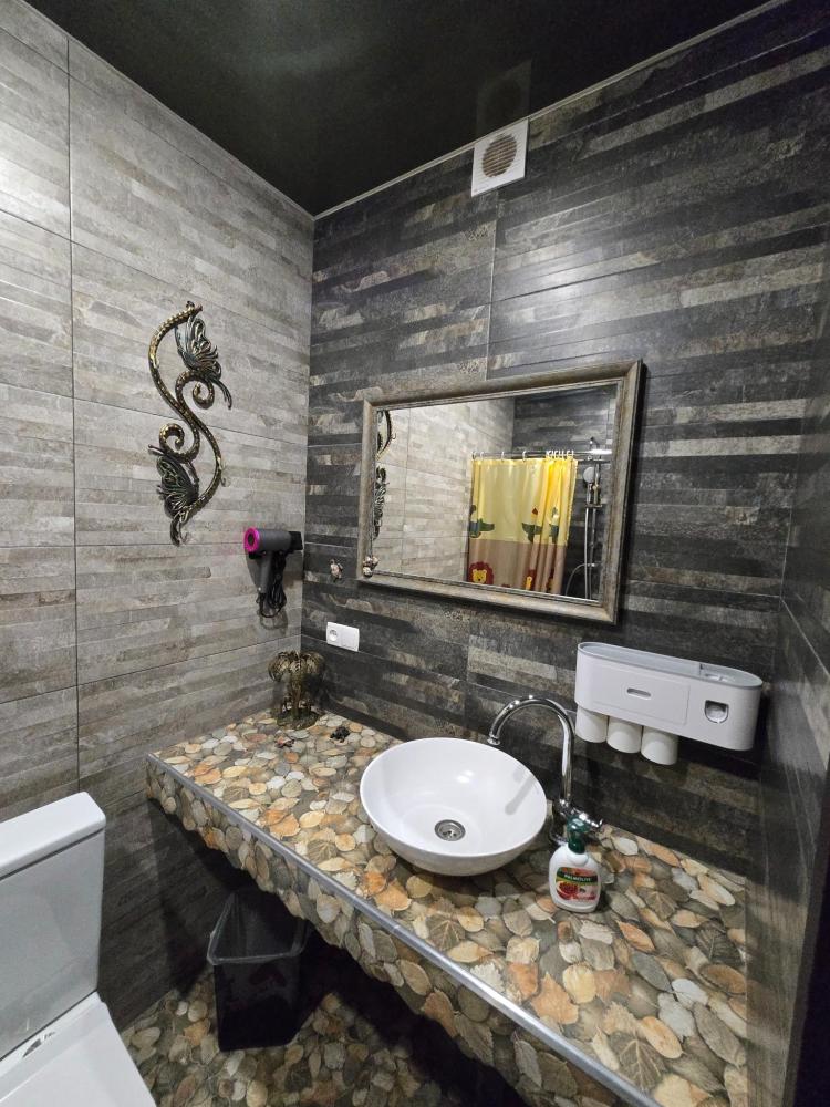 ✨ Спальня Просторная кровать с мягким изголовьем подарит комфортный сон. Большое окно с золотистыми шторами наполняет комнату светом и создаёт настроение утреннего пробуждения. Для отдыха и удобства — небольшой столик с креслом и пуфик. Современный телевизор — для уютных вечеров в номере. Атмосферный глянцевый потолок в красных тонах делает интерьер ярким и необычным. Ванная комната Стильная раковина «золотая чаша» добавляет изысканности. Фен, зеркало и всё необходимое для комфорта. Этот номер — не просто место для сна, уютный, стильный . Идеален для пары, друзей или путешественников, которые хотят отдохнуть с комфортом и улыбкой.
