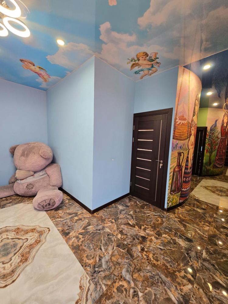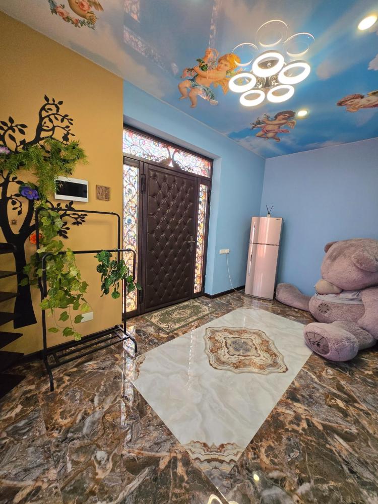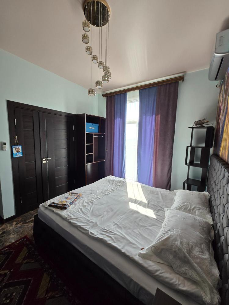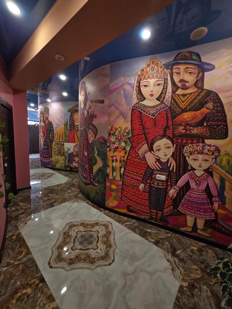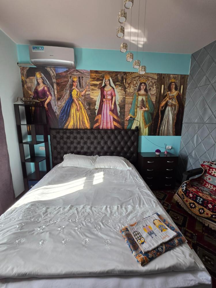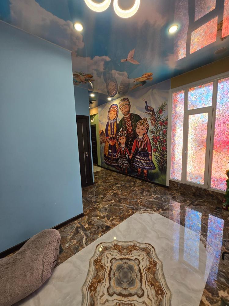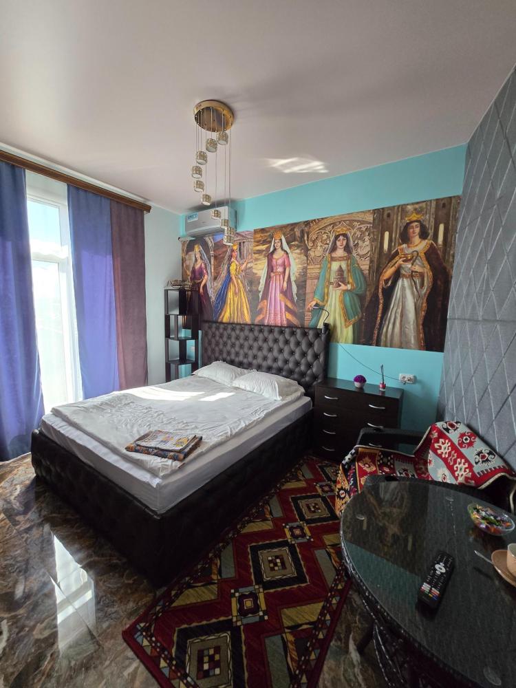 Просторная кровать с высоким мягким изголовьем подарит вам ощущение уюта и полноценного отдыха. Белоснежное постельное бельё с изящной вышивкой подчёркивает чистоту и свежесть комнаты. Интерьер Главным акцентом стала художественная роспись на стене с образами царственных красавиц, придающая номеру неповторимую атмосферу. Современная люстра с каскадом хрустальных элементов добавляет лёгкости и света. Уютные детали На полу – стильный ковёр с национальными узорами, создающий тепло и домашний уют. Для отдыха и чаепития есть удобное кресло с орнаментальным пледом и столик из стекла. Комфорт в любую погоду Номер оснащён кондиционером и просторным окном с плотными шторами, благодаря чему здесь всегда будет идеальный климат и уютная атмосфера. Этот номер идеально подойдёт для романтического отдыха пары или для путешественников, ценящих стиль, национальный колорит и комфорт.