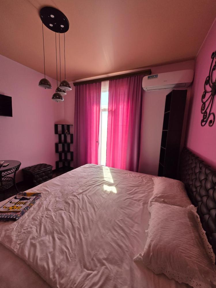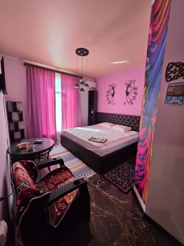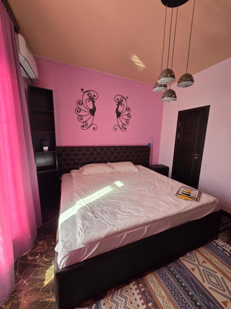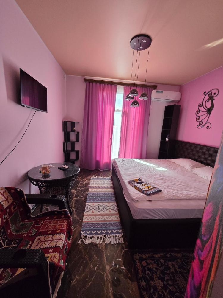 Большая двуспальная кровать с высоким мягким изголовьем дарит удобство и спокойный сон. Яркий акцент — нежные розовые стены и шторы, создающие атмосферу уюта и лёгкой романтики. Интерьер с изюминкой Изящные декоративные элементы на стенах в виде птиц придают комнате особый шарм. Современное освещение с дизайнерскими подвесными светильниками наполняет пространство мягким светом. ☕ Зона отдыха Удобное кресло с ярким покрывалом и круглый столик идеально подойдут для чашки ароматного кофе или неспешного вечера. Современная ванная Стильная раковина с зеркальной поверхностью, оригинальное панно, фен, душ и все необходимые удобства создают ощущение комфорта и заботы о гостях. Для удобства — Кондиционер для идеального климата — Бесплатный Wi-Fi — Телевизор и всё, что нужно для отдыха Этот номер станет отличным выбором как для романтической поездки, так и для комфортного путешествия друзей или семьи.