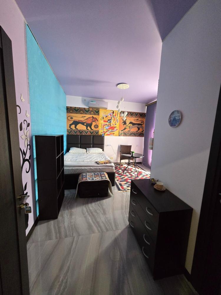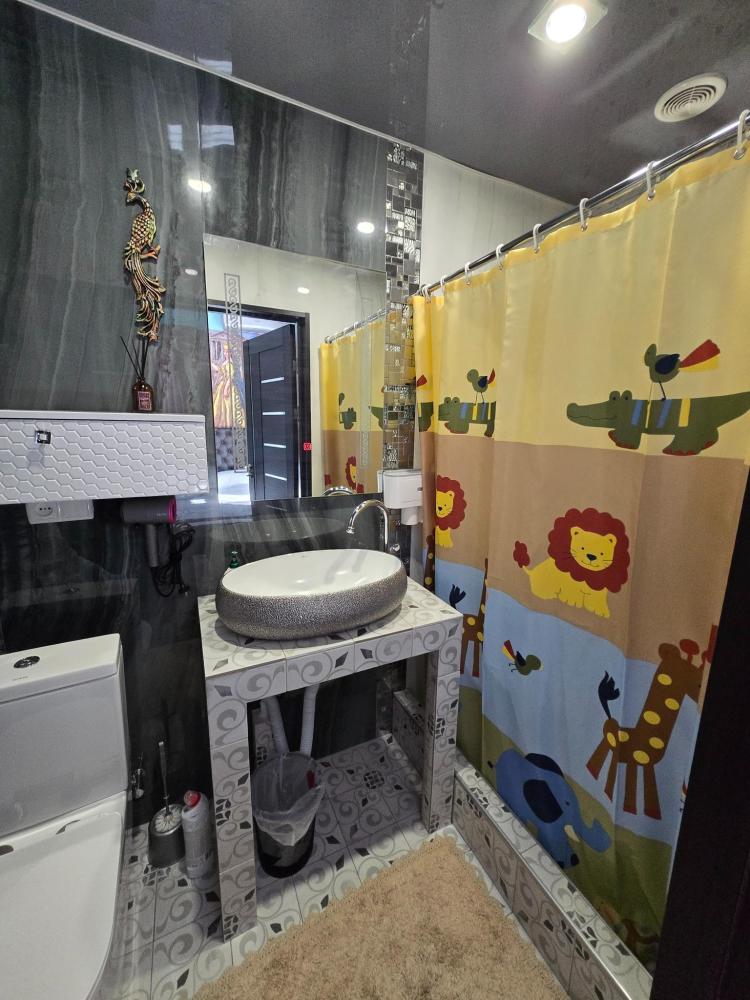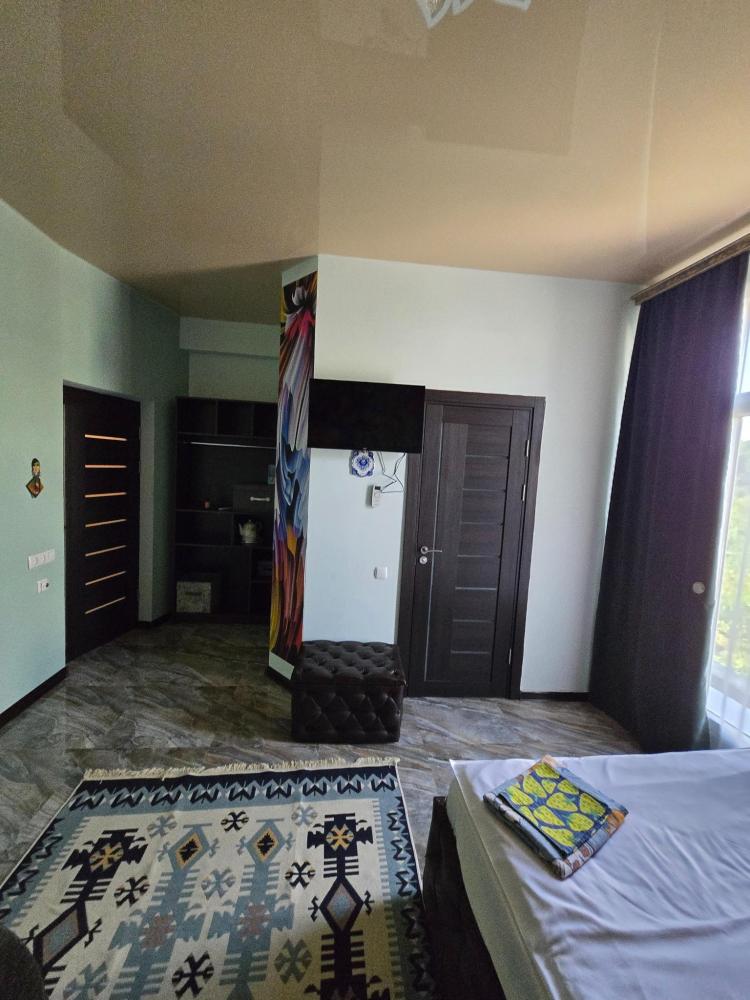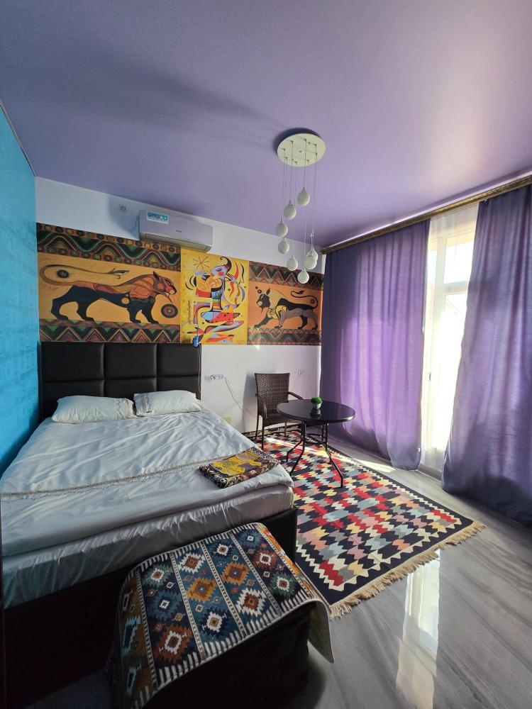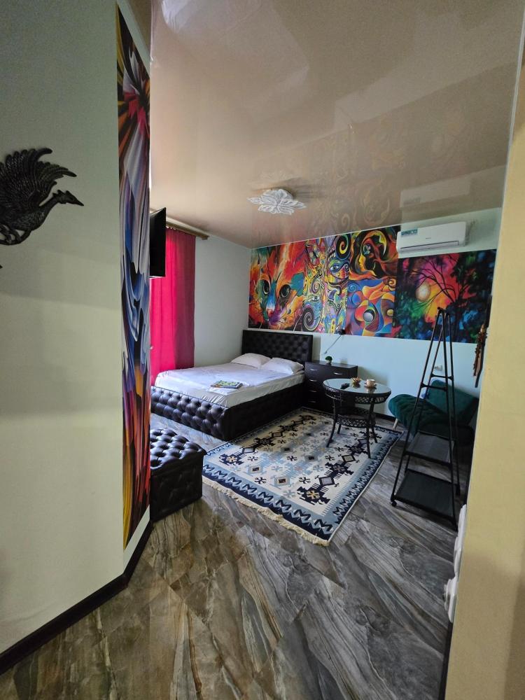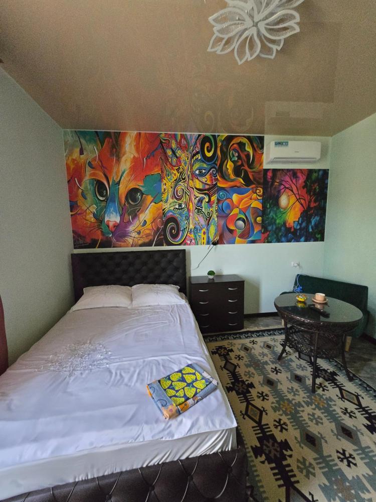 В центре комнаты расположена большая двуспальная кровать с высоким мягким изголовьем. Белоснежное постельное бельё создаёт атмосферу чистоты и уюта. Яркий и вдохновляющий интерьер Главный акцент — красочные арт-панно на стене, которые превращают номер в пространство с творческой энергетикой. На полу — стильный ковёр с этническими мотивами, а мягкие шторы наполняют комнату теплом и уединённостью. ☕ Уютная зона отдыха Для неспешного вечера гостей ждёт столик с креслами, где можно выпить чашечку кофе или чая. Современная ванная комната Ванная оформлена в стильных тонах с элементами под натуральный камень. Здесь есть просторная душевая, элегантная раковина-чаша, фен и всё необходимое для удобства. ❄ Удобства для гостей — Кондиционер для прохлады и свежести — Телевизор и бесплатный Wi-Fi — Декоративные элементы, создающие атмосферу уюта ? Этот номер станет идеальным выбором для тех, кто ценит необычный дизайн, современный комфорт и тёплую атмосферу.