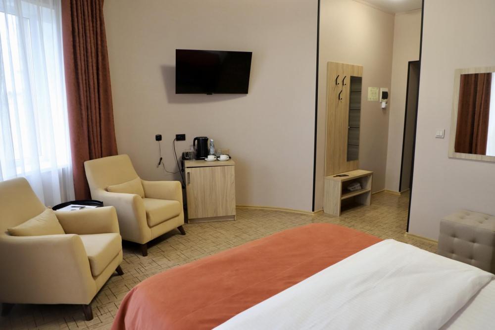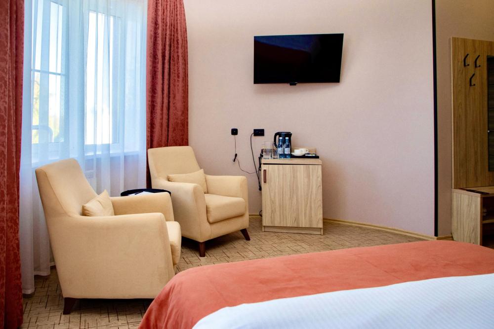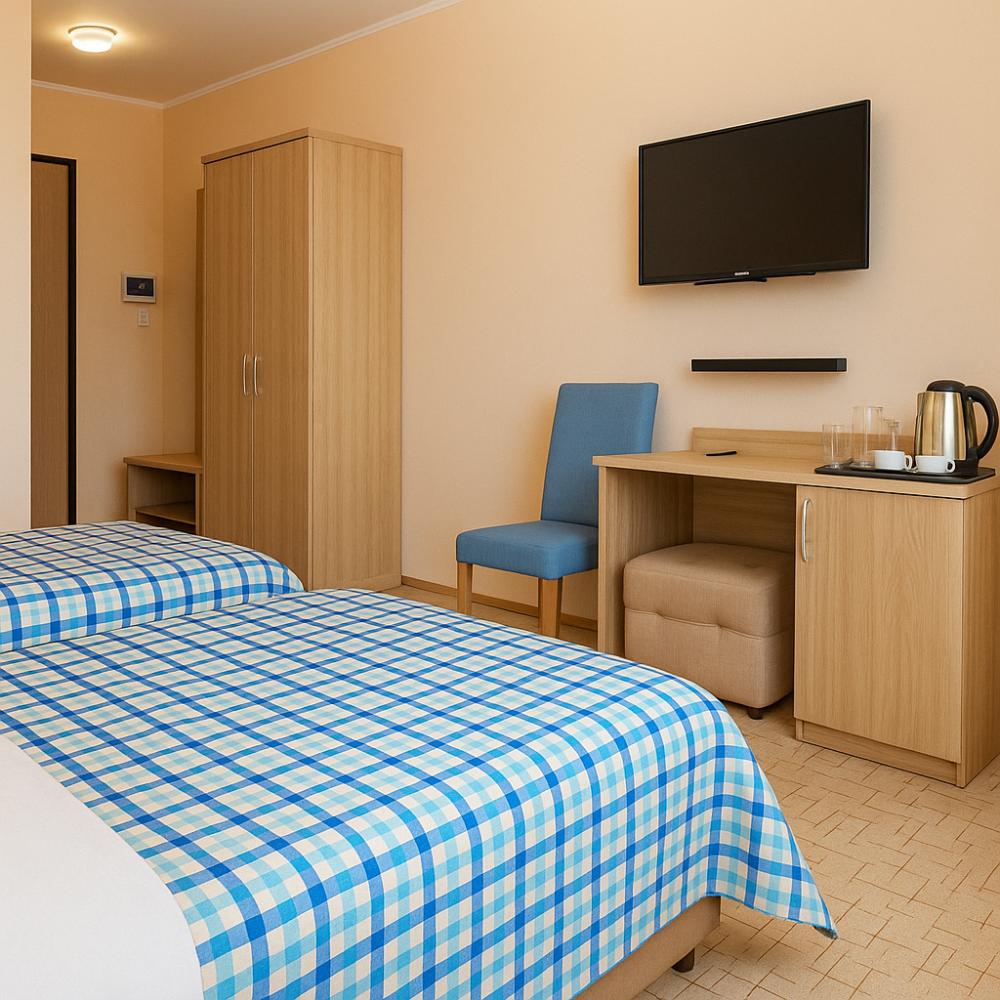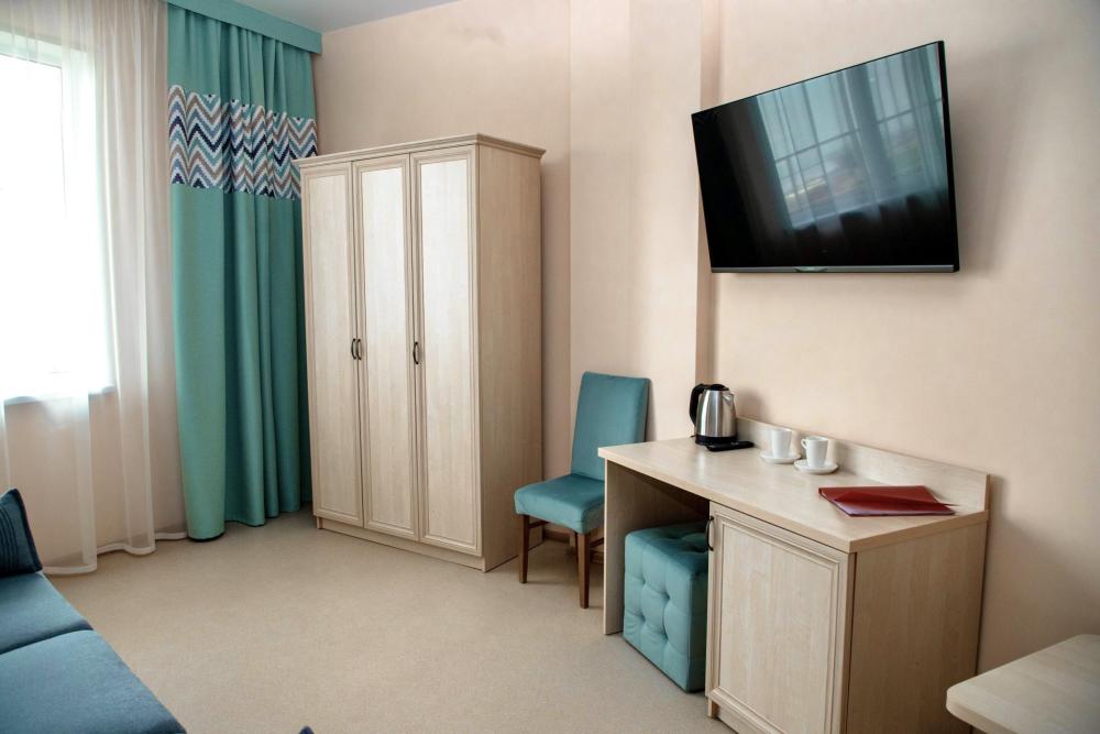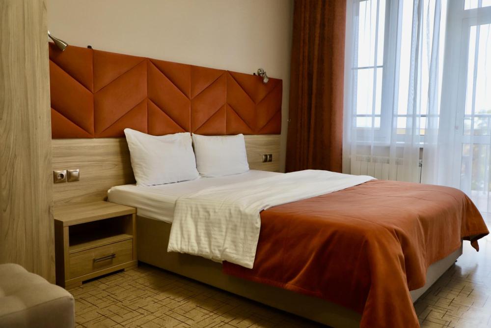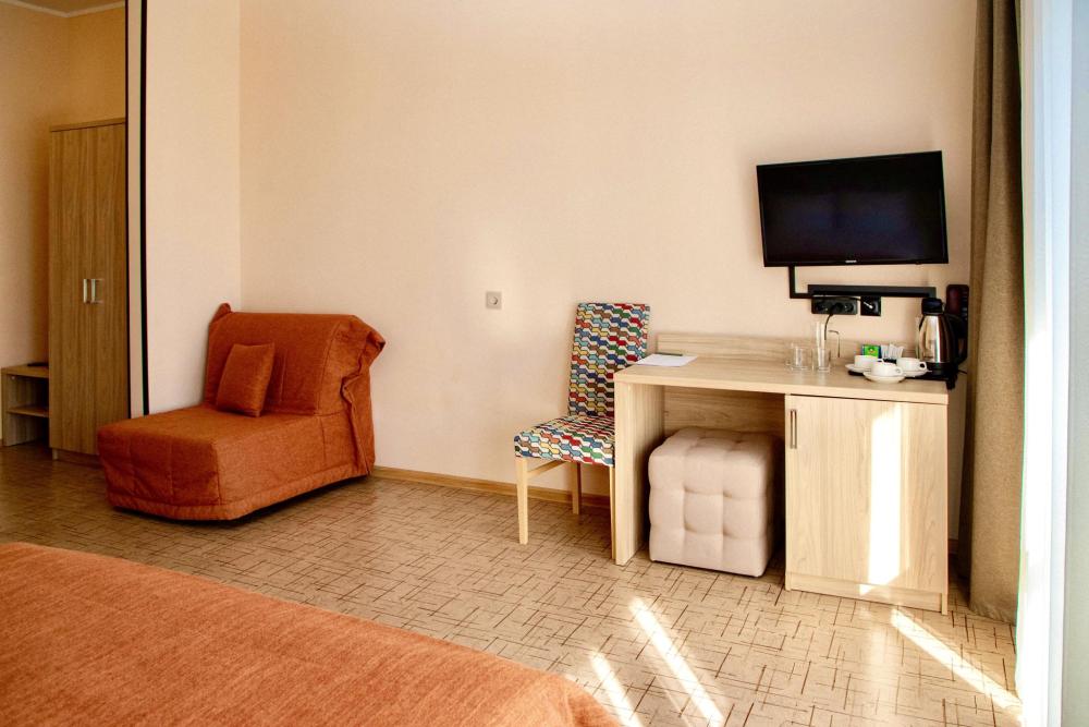 Просторный однокомнатный номер с балконом и видом на море, общей площадью от 21 кв. м до 30 кв. м. Укомплектован двуспальной кроватью, удобным рабочим местом, журнальным столиком, двумя стульями, шкафом для одежды. Номер оснащен индивидуальной системой кондиционирования, телевизором, холодильником, бесплатным Wi-Fi, чайником. Ванная комната оснащена душевой кабиной и укомплектована набором полотенец, косметическими принадлежностями, феном, халатами, тапочками.