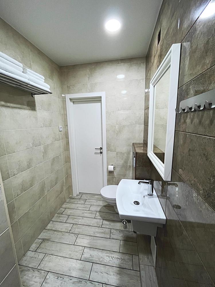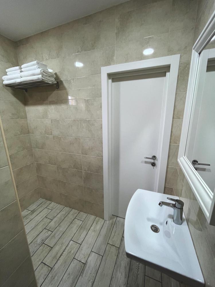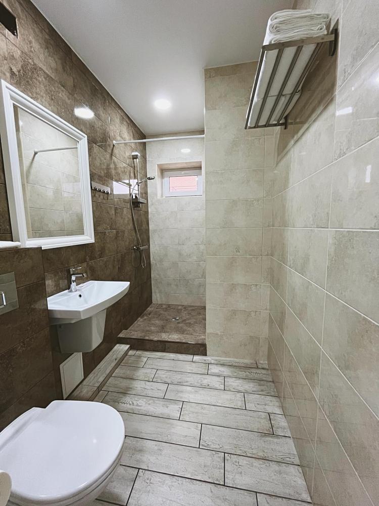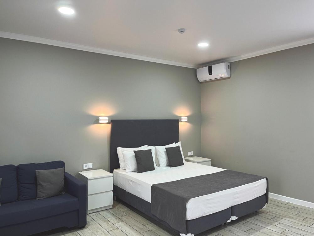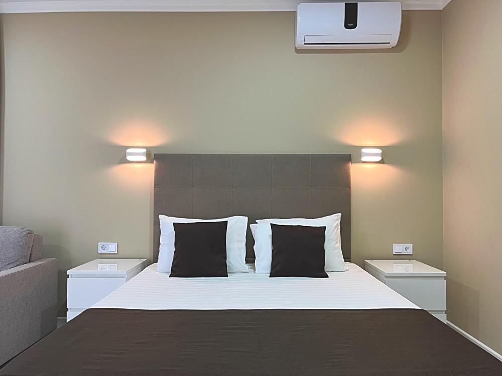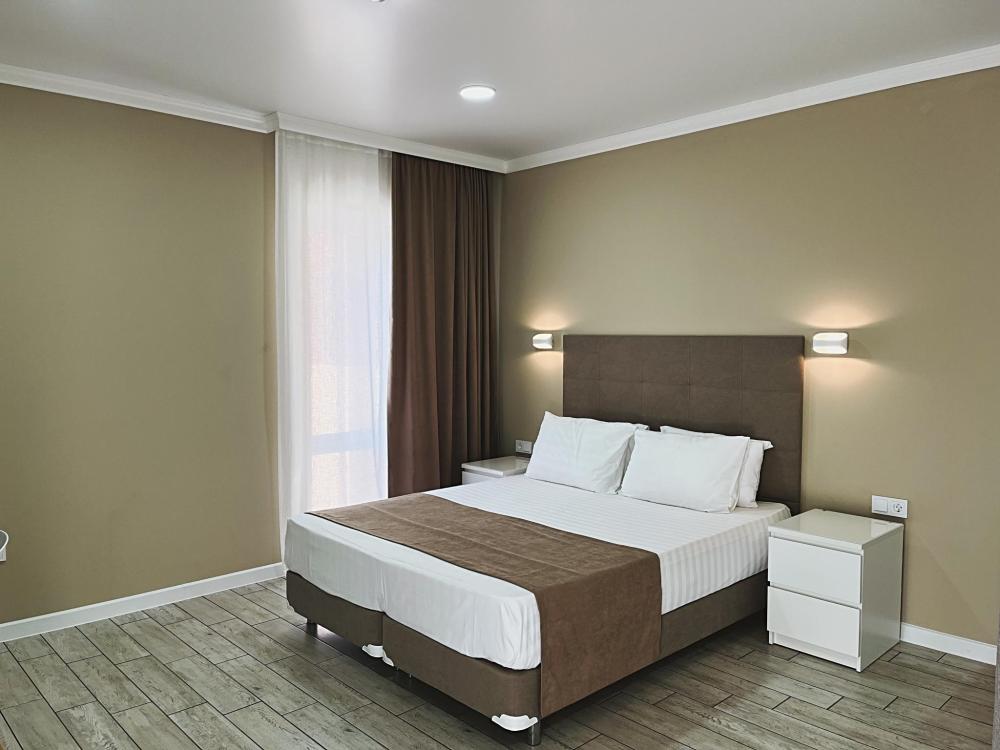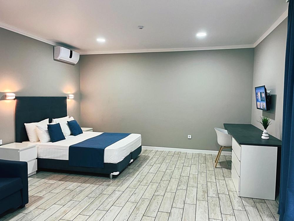 Семейный номер с большой двуспальной кроватью и диваном кроватью на два места. Расположен на первом этаже здания. Имеет собственную террасу с обеденным столом и креслами. Номер оснащен всем необходимым для комфортного отдыха всех членов семьи: инверторная бесшумная сплит система, телевизор со smart tv, интернет по каналу Wi-Fi, удобный сан.узел с термостатическими смесителями, интерьерное освещение, большие панорамные алюминиевые окна, москитные сетки, постельное белье из белого страйп сатина, имеется меню из гиппоалергенных подушек, комплект махровых полотенец, комплект индивидуальных гигиенических средств (мыло, гель для душа, шампунь), пожарная сигнализация, теплый пол по всему помещению (для холодного времени года).