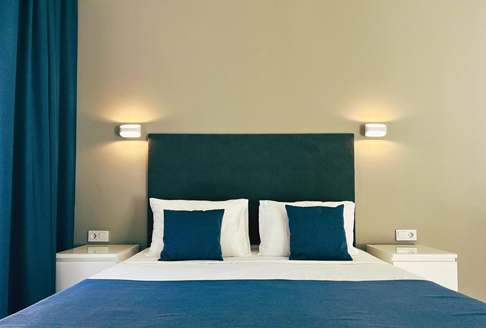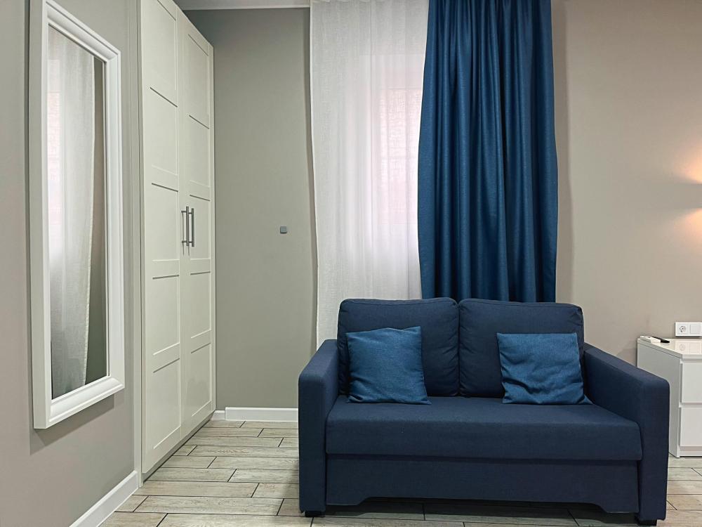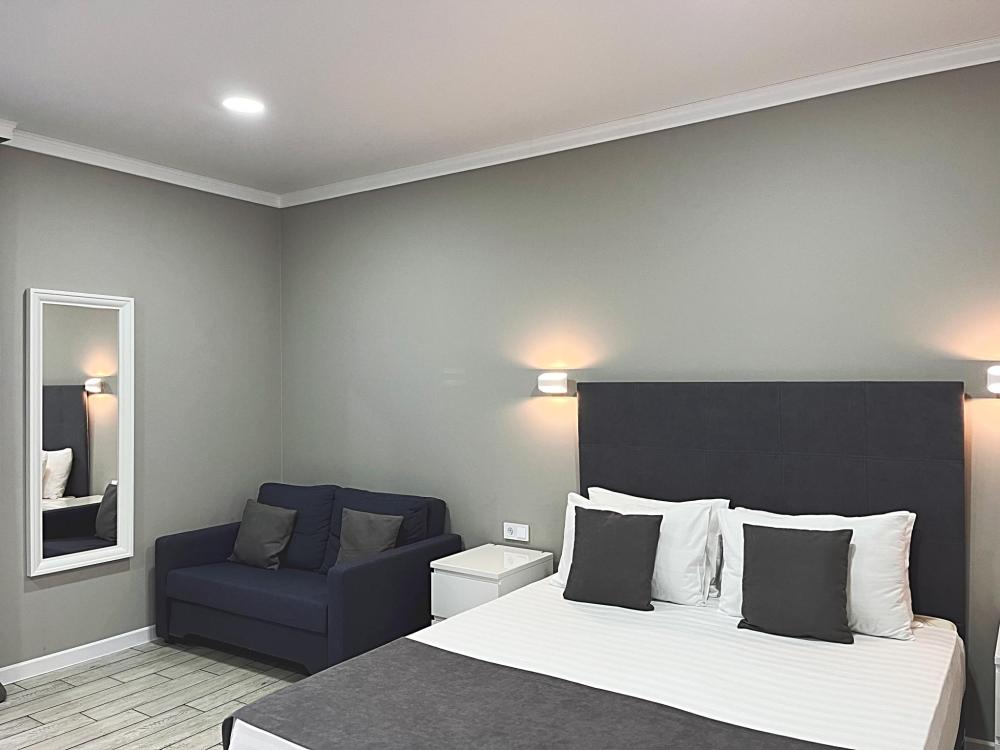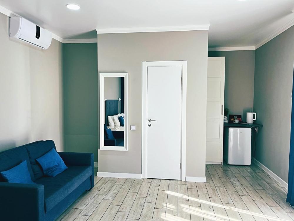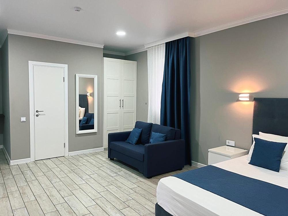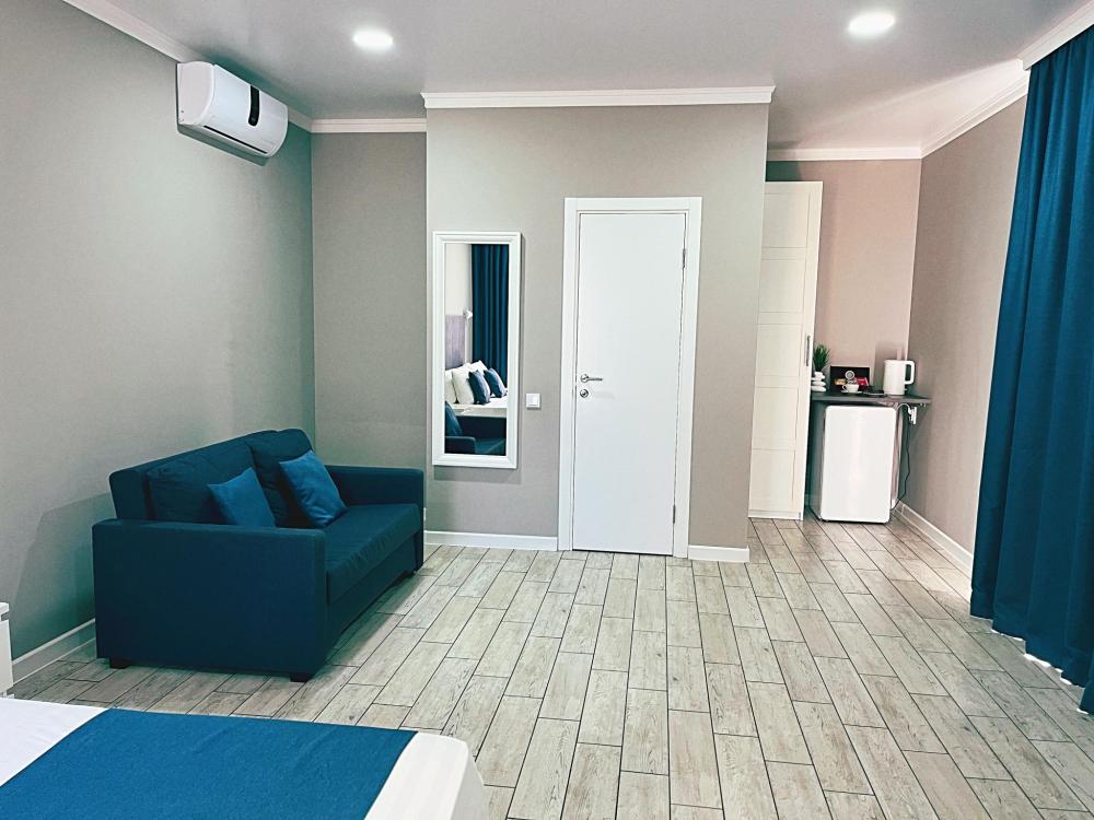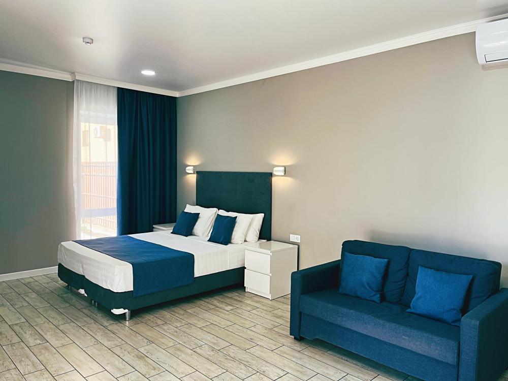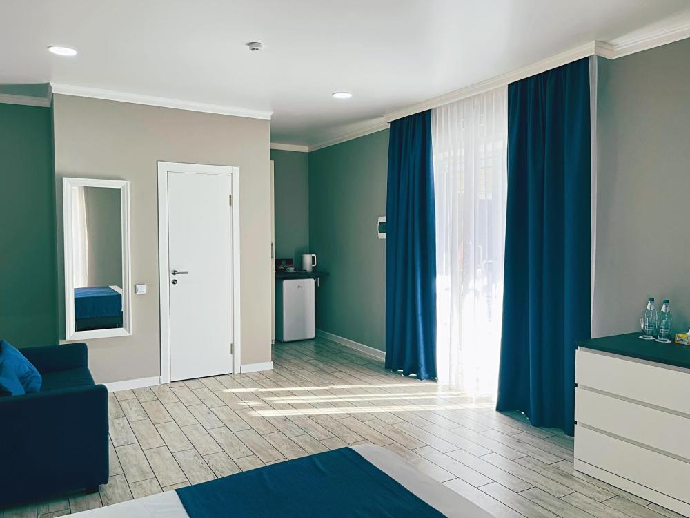 Семейный номер с большой двуспальной кроватью и диваном кроватью на два места. Расположен на втором этаже здания. Из окон номера открывается вид на море. Номер имеет собственную террасу с обеденным столом и креслами. Номер оснащен всем необходимым для комфортного отдыха всех членов семьи: инверторная бесшумная сплит система, телевизор со smart tv, интернет по каналу Wi-Fi, удобный сан. узел с термостатическими смесителями, интерьерное освещение, большие панорамные алюминиевые окна, москитные сетки, постельное белье из белого страйп сатина, имеется меню из гиппоалергенных подушек, комплект махровых полотенец, комплект индивидуальных гигиенических средств (мыло, гель для душа, шампунь), пожарная сигнализация, теплый пол по всему помещению (для холодного времени года).