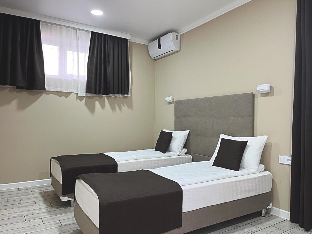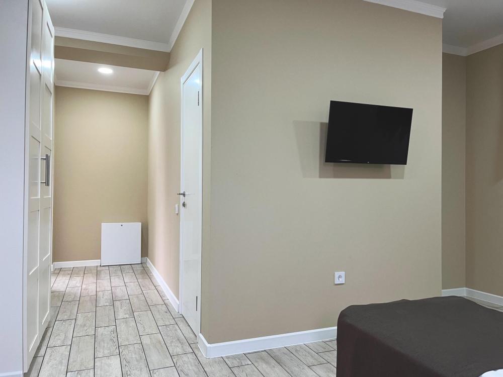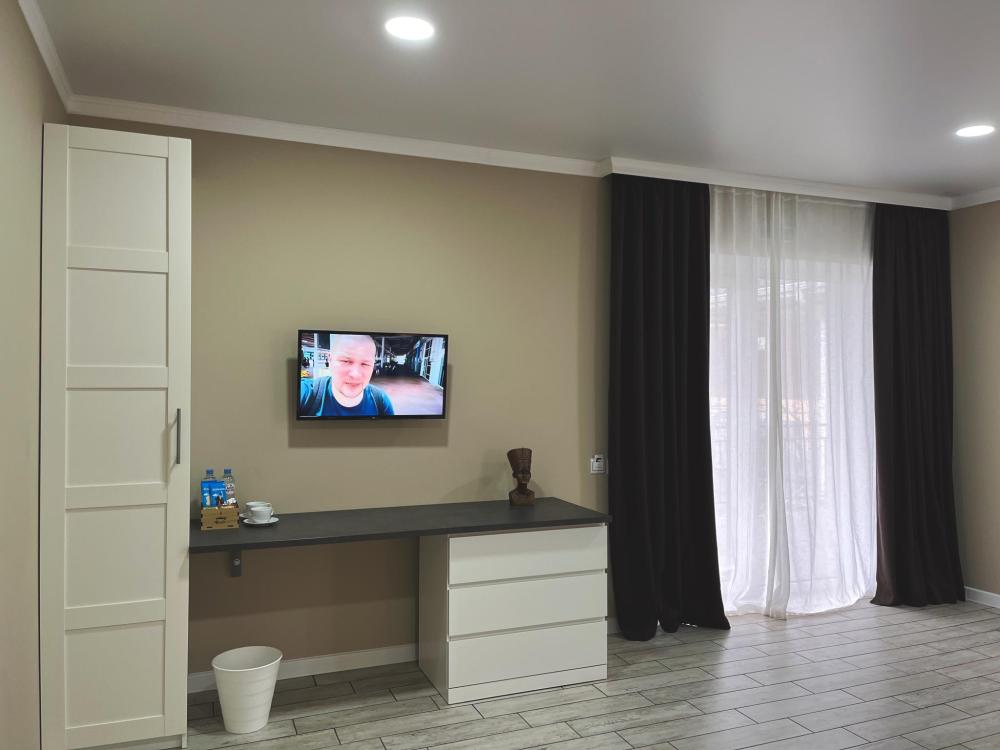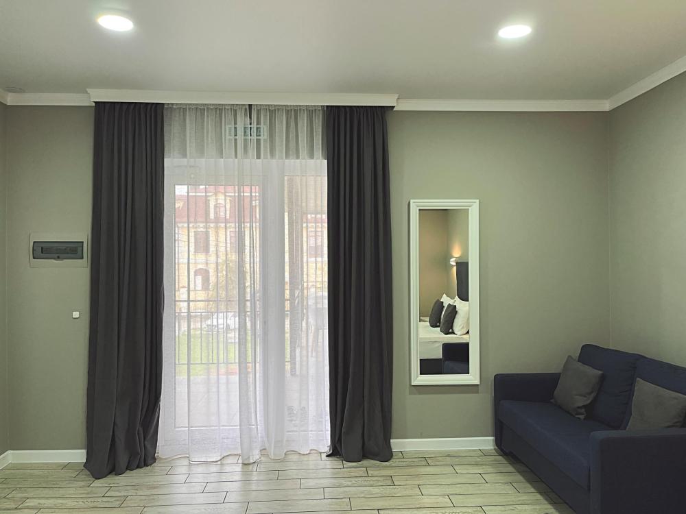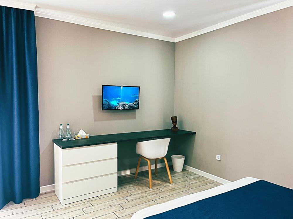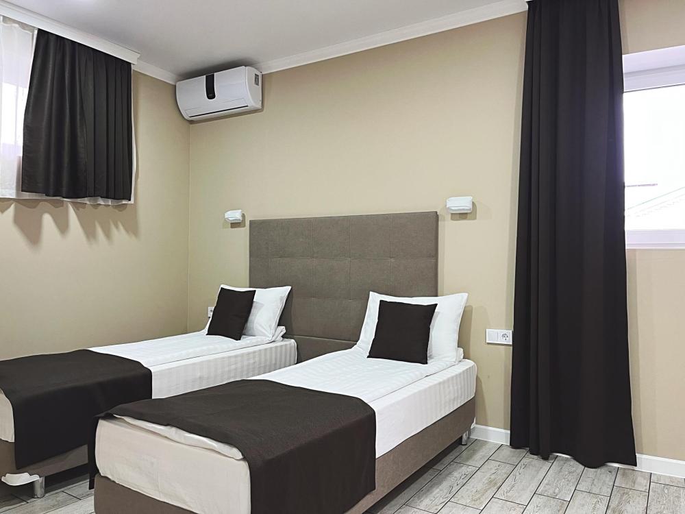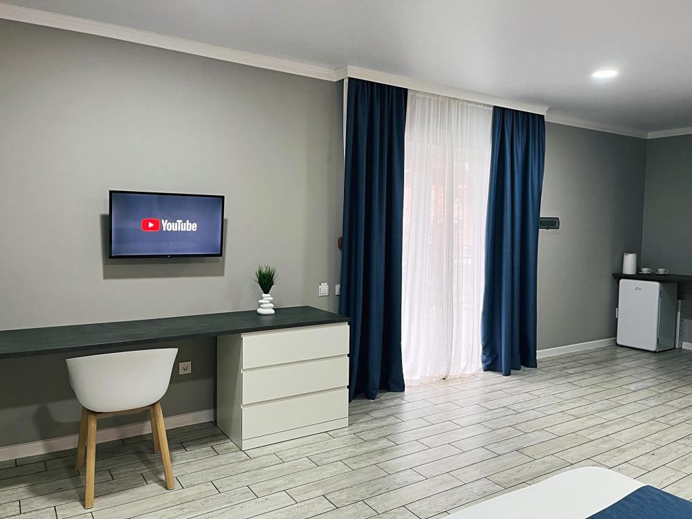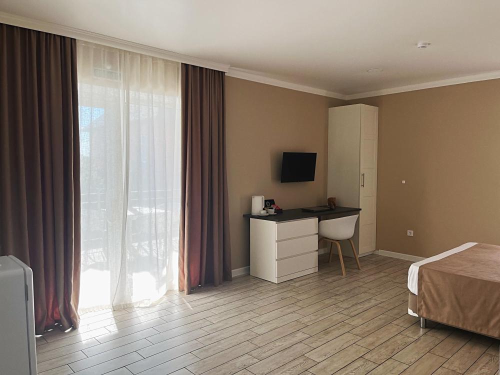Семейный номер с большой двуспальной кроватью и диваном кроватью на два места. Расположен на первом этаже здания. Имеет собственную террасу с обеденным столом и креслами. Номер оснащен всем необходимым для комфортного отдыха всех членов семьи: бесшумная сплит система инвентарного типа, телевизор со smart tv от производителя Mi, интернет по каналу Wi-Fi до 300 мБ/с, удобный сан. узел с термостатическими смесителями, интерьерное освещение, большие панорамные алюминиевые окна, москитные сетки, постельное белье из белого страйп сатина, имеется меню из гиппоалергенных подушек, комплект махровых полотенец, комплект индивидуальных гигиенических средств (одноразовые: мыло, гель для душа, шампунь, туалетная бумага, пакеты для мусора), пожарная сигнализация, теплый пол по всему помещению (для холодного времени года).