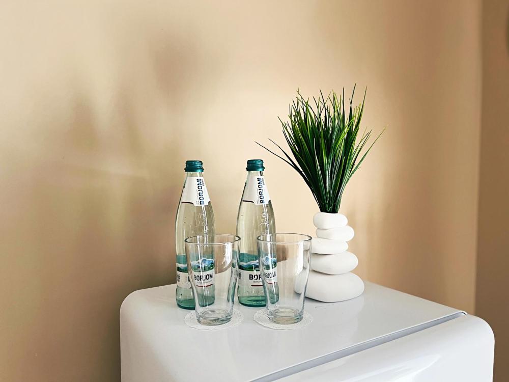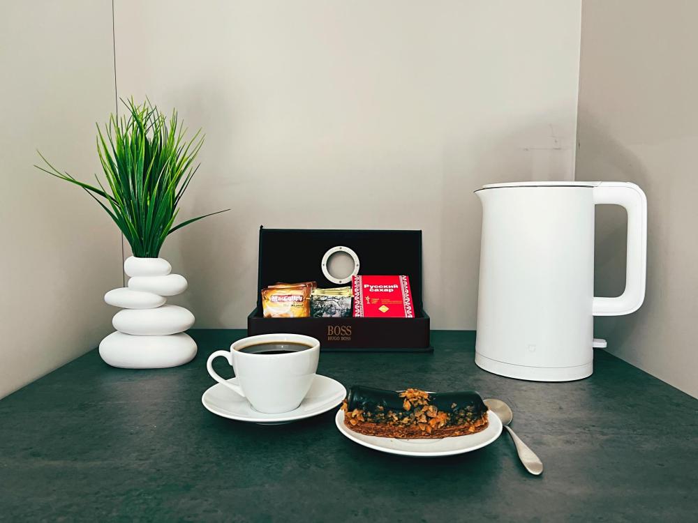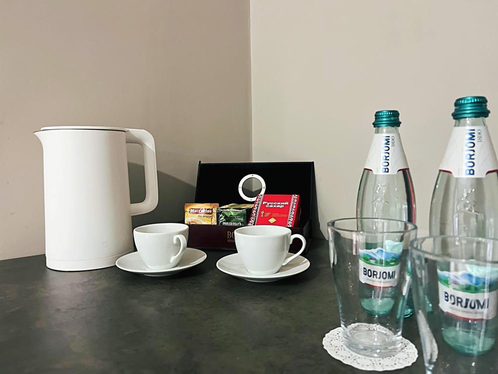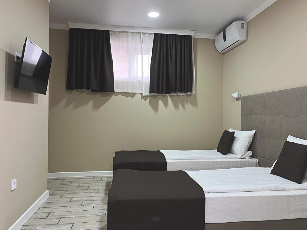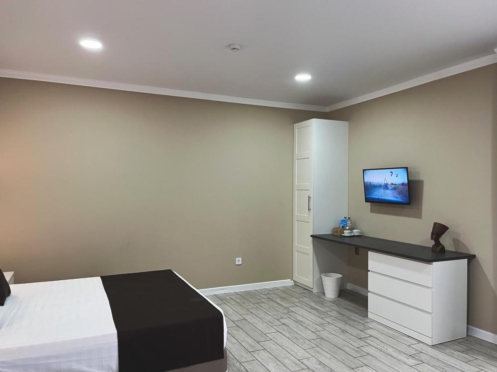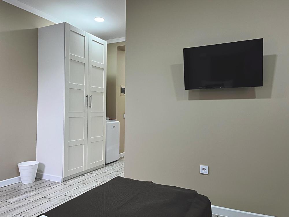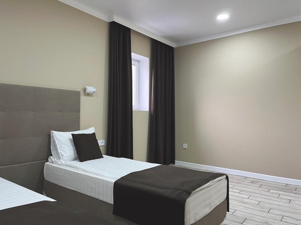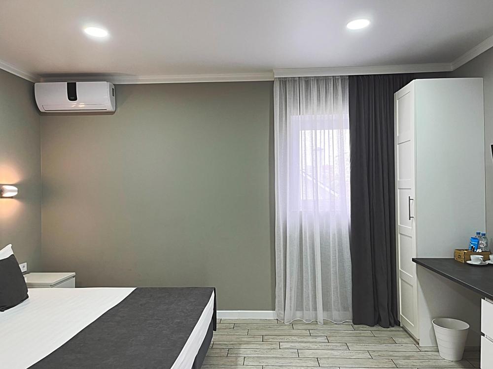 Семейный номер с большой двуспальной кроватью и диваном кроватью на два места. Расположен на первом этаже здания. Имеет собственную террасу с обеденным столом и креслами. Номер оснащен всем необходимым для комфортного отдыха всех членов семьи: бесшумная сплит система инвентарного типа, телевизор со smart tv от производителя Mi, интернет по каналу Wi-Fi до 300 мБ/с, удобный сан. узел с термостатическими смесителями, интерьерное освещение, большие панорамные алюминиевые окна, москитные сетки, постельное белье из белого страйп сатина, имеется меню из гиппоалергенных подушек, комплект махровых полотенец, комплект индивидуальных гигиенических средств (одноразовые: мыло, гель для душа, шампунь, туалетная бумага, пакеты для мусора), пожарная сигнализация, теплый пол по всему помещению (для холодного времени года).