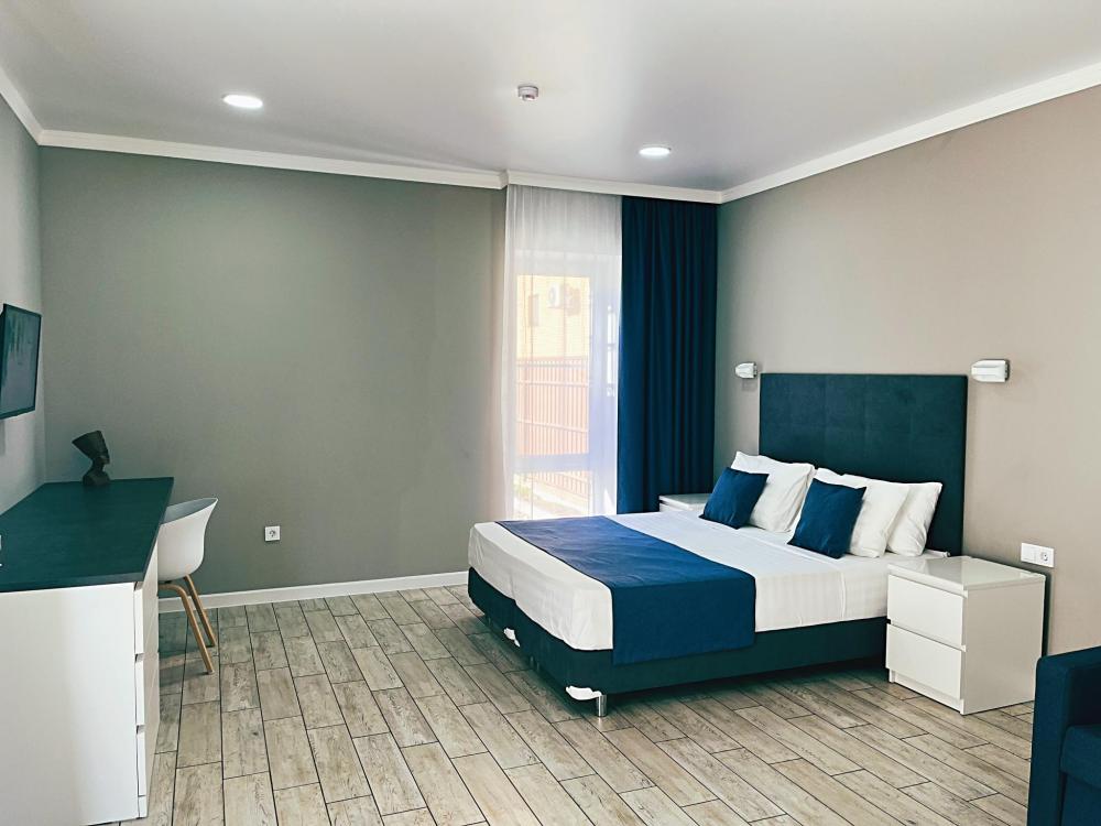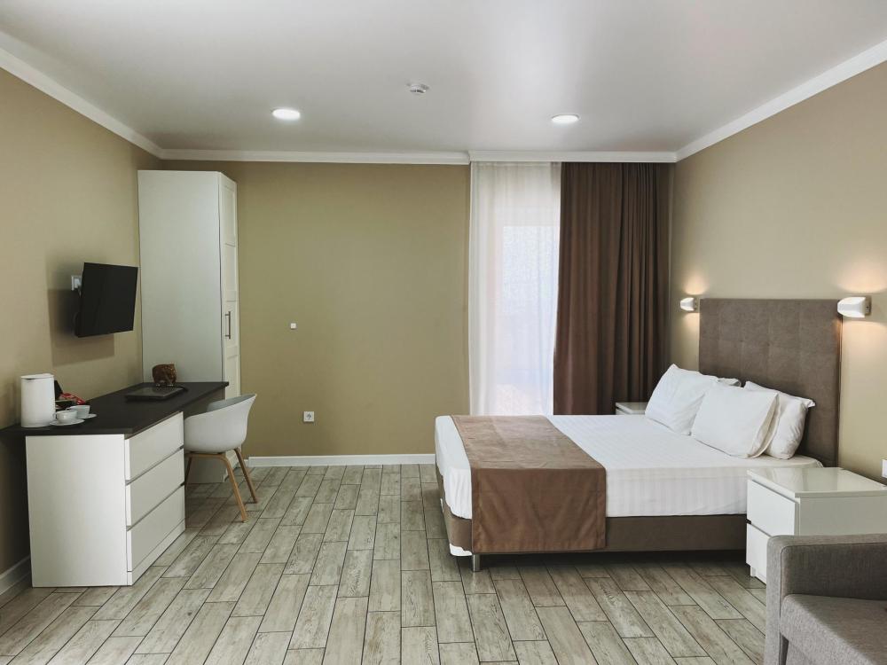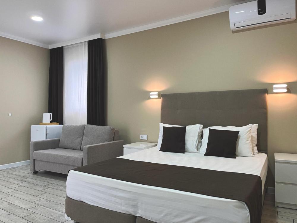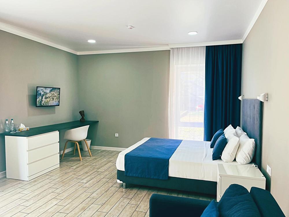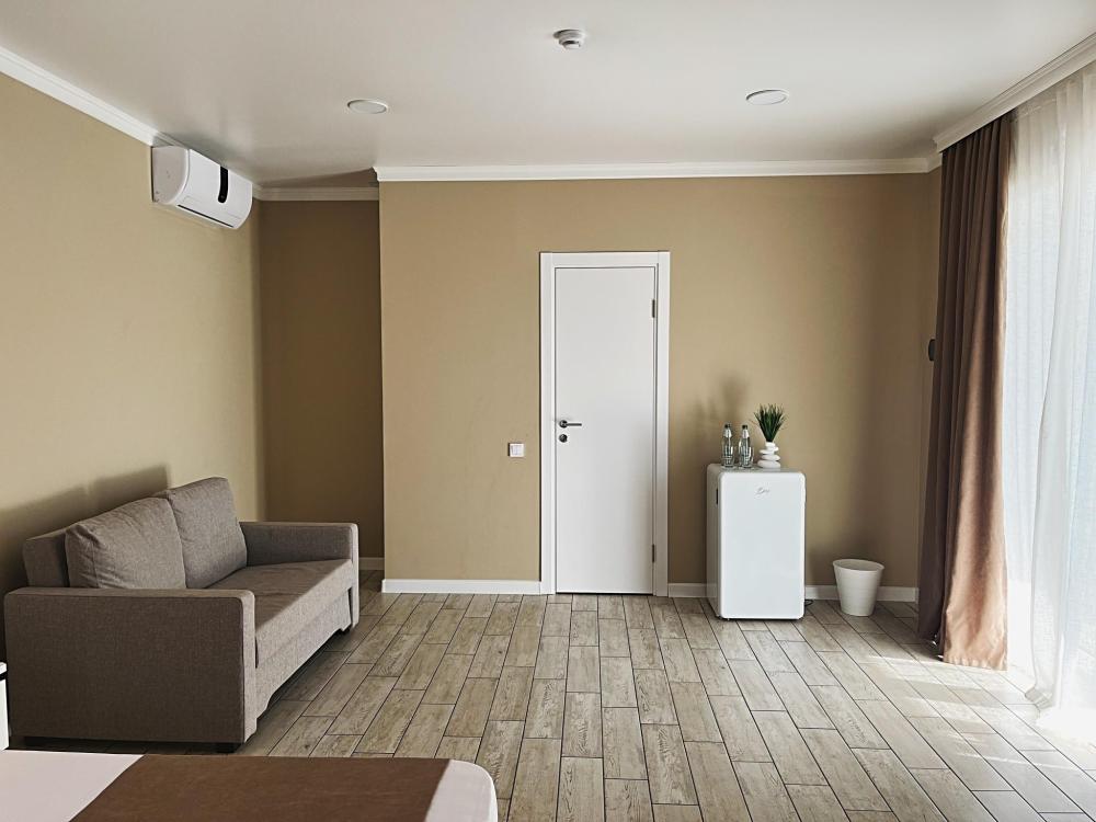 Номер с большой двуспальной кроватью и диваном кроватью. Расположен на первом этаже здания. Имеет собственную террасу с обеденным столом и креслами. Номер оснащен всем необходимым для комфортного отдыха: инверторная бесшумная сплит система, телевизор со smart tv, интернет по каналу Wi-Fi, удобный сан.узел с термостатическими смесителями, интерьерное освещение, большие панорамные окна, москитные сетки, постельное белье из белого страйп сатина, имеется меню из гиппоалергенных подушек, комплект махровых полотенец, комплект индивидуальных гигиенических средств (мыло, гель для душа, шампунь), пожарная сигнализация, теплый пол по всему помещению (для холодного времени года).