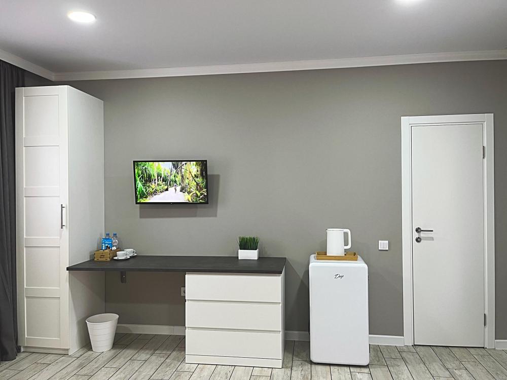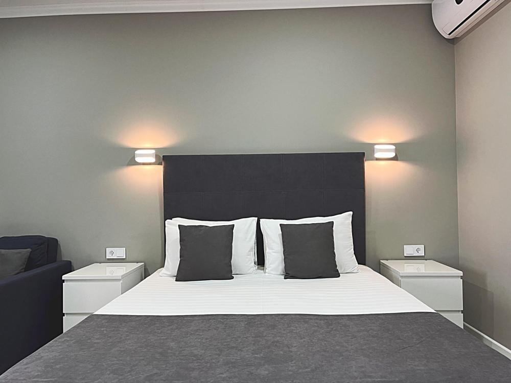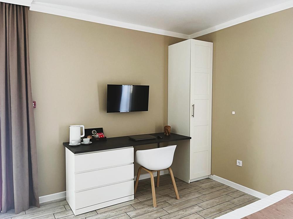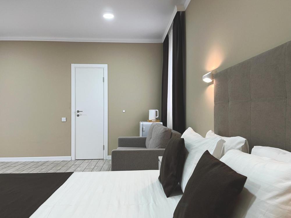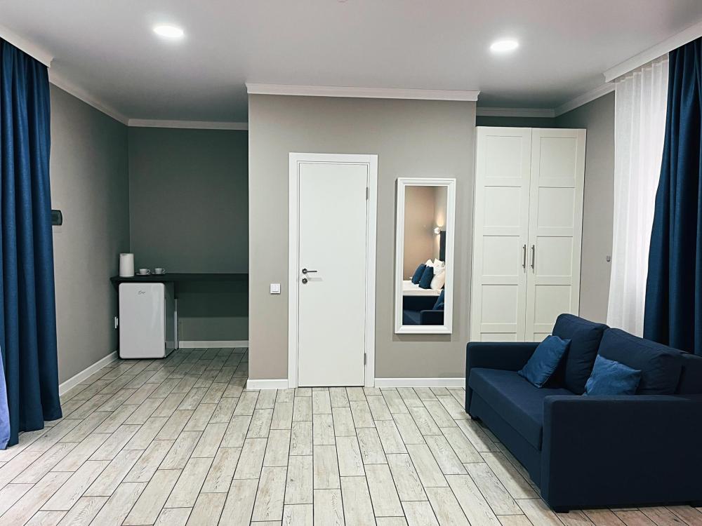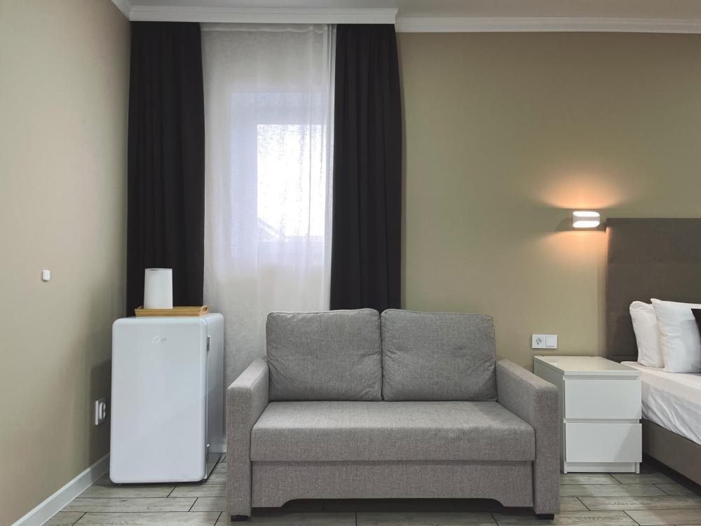 Номер с большой двуспальной кроватью и диваном кроватью. Расположен на первом этаже здания. Имеет собственную террасу с обеденным столом и креслами. Номер оснащен всем необходимым для комфортного отдыха: инверторная бесшумная сплит система, телевизор со smart tv, интернет по каналу Wi-Fi, удобный сан.узел с термостатическими смесителями, интерьерное освещение, большие панорамные окна, москитные сетки, постельное белье из белого страйп сатина, имеется меню из гиппоалергенных подушек, комплект махровых полотенец, комплект индивидуальных гигиенических средств (мыло, гель для душа, шампунь), пожарная сигнализация, теплый пол по всему помещению (для холодного времени года).