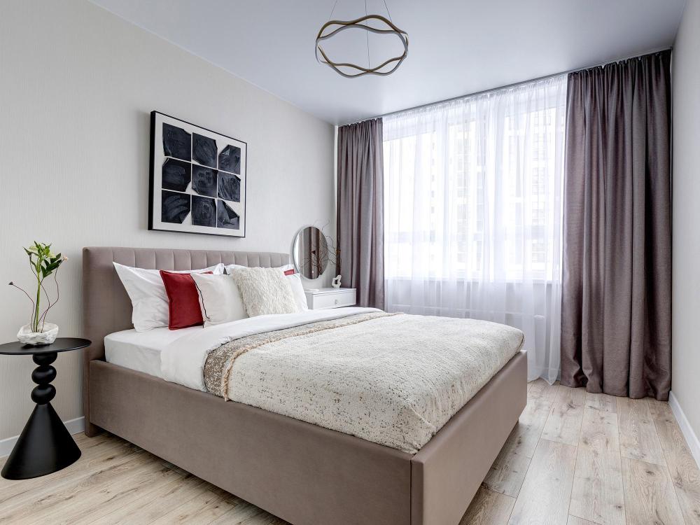 Евротрёхкомнатная квартира с балконом на 9 этаже. В квартире есть 2 полноценные отдельные спальни и просторная кухня-гостиная. В каждой спальне двуспальная кровать, в одной есть шкаф для вещей и тумбочки, во второй - рабочий стол и открытый комод. В коридоре большой шкаф....