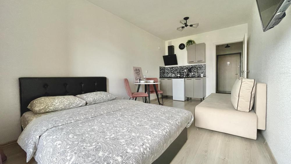 - двуспальная кровать с приятным постельным бельем 100% хлопок, - раскладной двуспальный диван, - кухонный гарнитур со всем необходимым для приготовления, - холодильник, эл. чайник, встроенная варочная поверхность. Постельное белье, полотенца, гель для душа, сахар, чай - все входит в стоимость аренды.