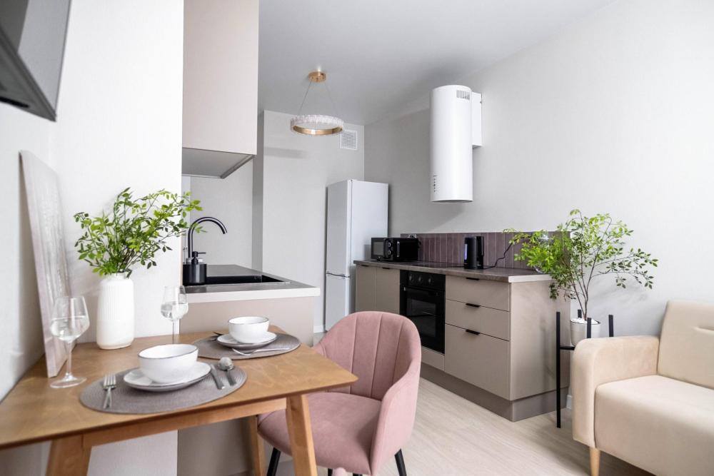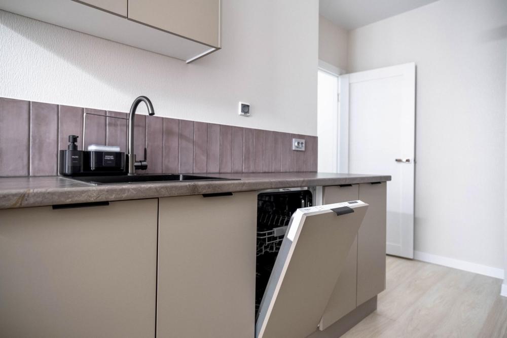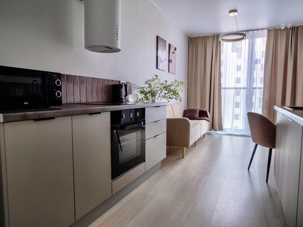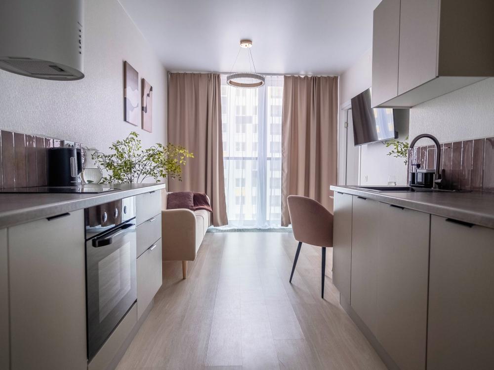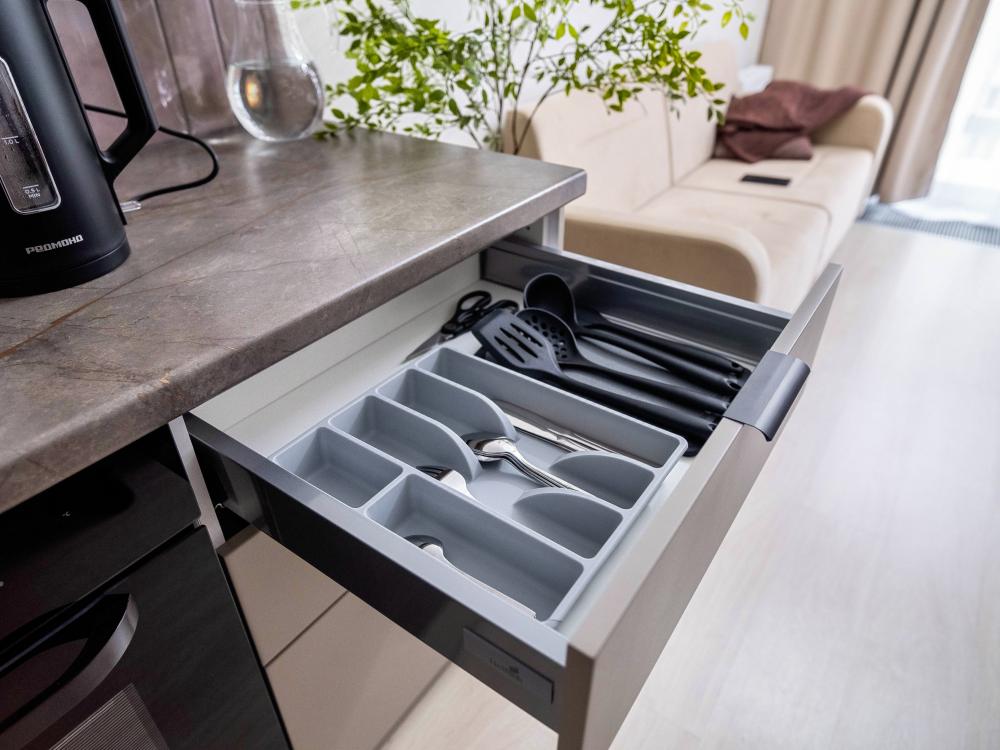 ✔ Кухня с посудой, приборами и необходимой техникой: посудомоечная машина, индукционная плита, вытяжка, духовая печь, чайник, микроволновая печь, холодильник
