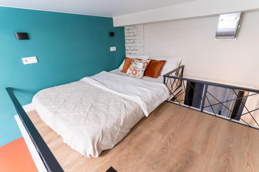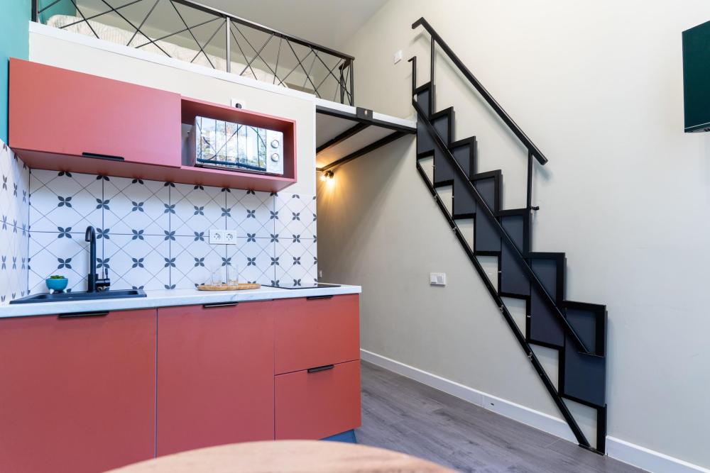 Современная двухярусная студия. Стильный ремонт с яркими акцентами, новая мебель и техника. Отделённая спальная зона на верхнем ярусе. Удобное расположение у центра города со всей необходимой транспортной развязкой. Апартамент предназначен для размещения 2 гостей. В апартаментах спальные места: 1 двуспальная кровать, Wi-fi, телевизор со смарт-ТВ, бойлер, кровать уже заправлена чистым и выглаженным постельным бельём, кухонная зона оборудована всей необходимой бытовой техникой и посудой, чай, сахар, индивидуальные ванные принадлежности для каждого гостя, фен, утюг, стиральная машина.