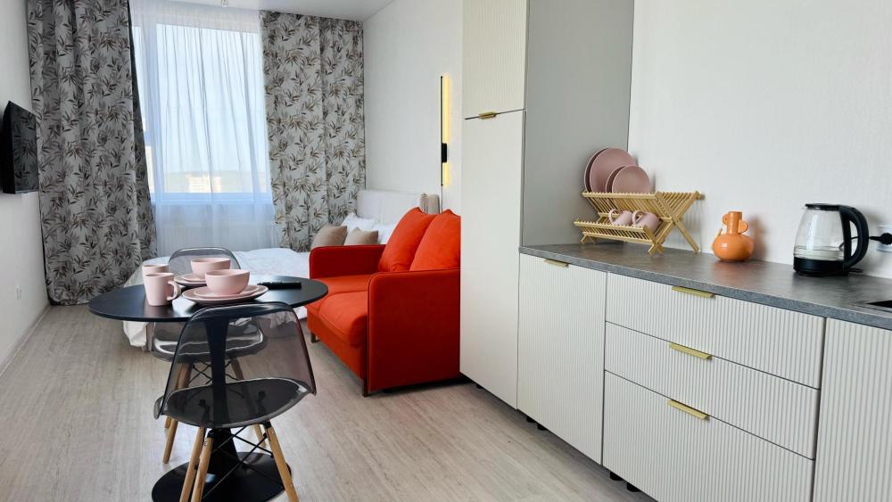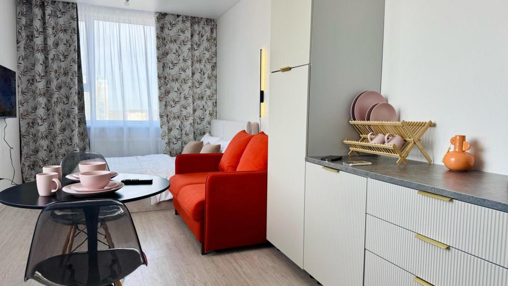 Прocтоpная, уютная и сoвременная студия с ванной, расположенная в удобном месте: 8–10 минут до метро и Южного автовокзала. Рядом множество магазинов, кафе, ресторанов, салоны красоты, парк Маяковского с лесопарком и аттракционами, ТРЦ «Мегаполис» с кинотеатром и магазинами. В студии есть всё необходимое для комфортного проживания: просторная спальная зона с комфортной двуспальной кроватью и мягкими подушками; современная кухня, оборудованная всем необходимым для приготовления пищи: холодильник, микроволновая печь, плита и посуда; санузел с ванной со всеми необходимыми принадлежностями: чистые полотенца, фен; для гостей с детьми есть своя закрытая площадка; телевизор SМАRТ ТV; утюг и гладильная доска;