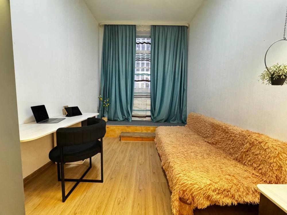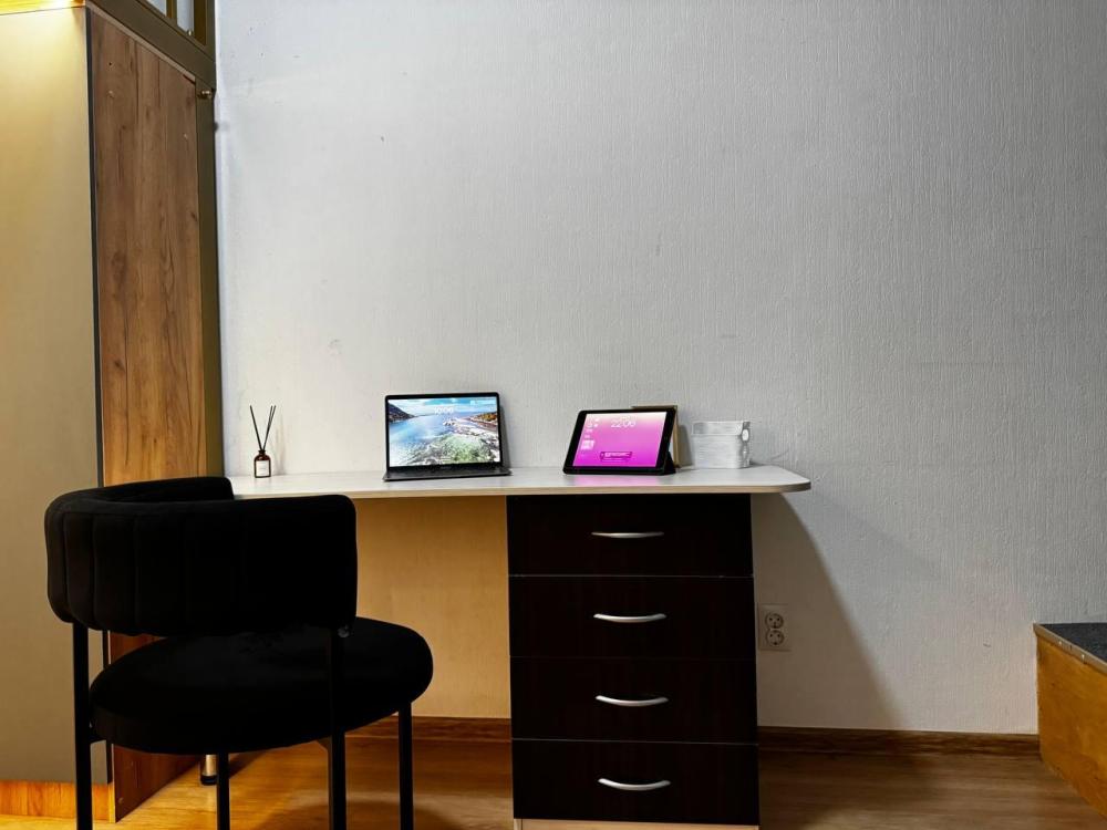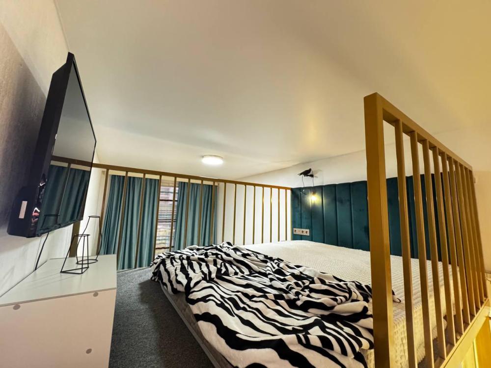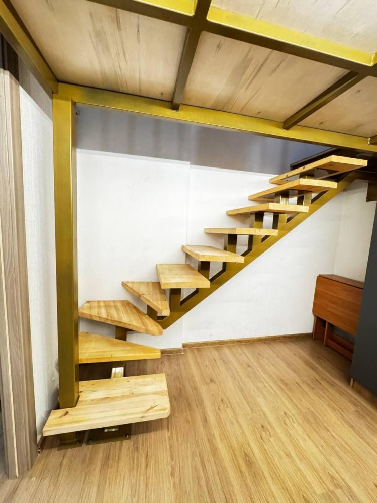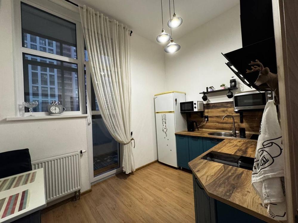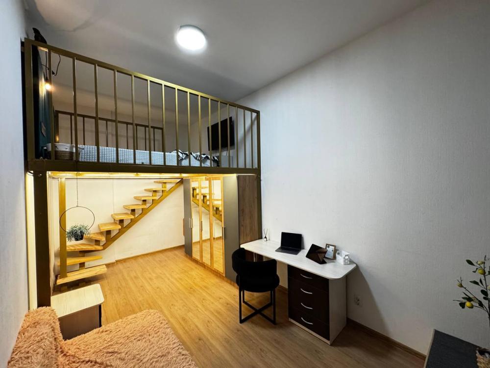 Двухуровневые апартаменты, оборудованные всем необходимым для комфортного проживания. В квартире есть двуспальная кровать с блэкаут-шторами для комфортного сна, дополнительное спальное место — диван, оборудованная кухня с плитой, холодильником, микроволновой печью и чайником, постельное белье и полотенца, стиральная машина, фен и отпариватель, а также чай, кофе, сахар и соль.