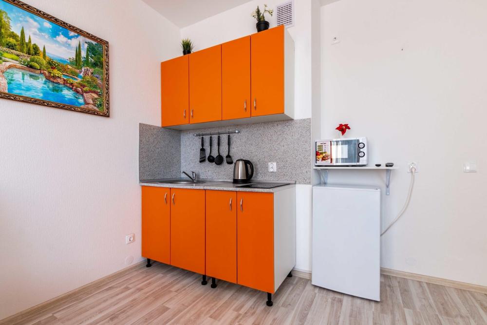 Однокомнатная просторная квартира-студия с качественным евроремонтом в современном стиле расположена в премиальном жилом комплексе «Монблан». Внешний облик комплекса – это выразительная архитектура, сочетание современного урбанистического дизайна с классическими материалами и решениями. В шаговой доступности не только развитая инфраструктура, но и удобная транспортная развязка – трамваи, автобусы, троллейбусы, станция метро «Ботаническая». Рядом находятся: ТЦ «Дирижабль» и «Глобус», аквапарк «Лимпопо», парк развлечений «Планета ИгриК», дельфинарий, аптеки, магазины, АЗС, выезд на объездную дорогу, Кольцовский тракт. В апартаментах 4 спальных места: двуспальная кровать и диван. Есть всё для уюта и комфортного проживания: телевизор, Wi-Fi, полотенца, постельные принадлежности, ванные принадлежности, чайные принадлежности, стиральная машина, микроволновая печь, фен, столовые приборы, посуда (кастрюля, сковорода). Мебель и двери в пастельных тонах разбавлены ярким оранжевым кухонным гарнитуром, дополняющим общую атмосферу яркими красками. Детали интерьера: картины, торшеры, комнатные растения — придают домашнего уюта помещению.