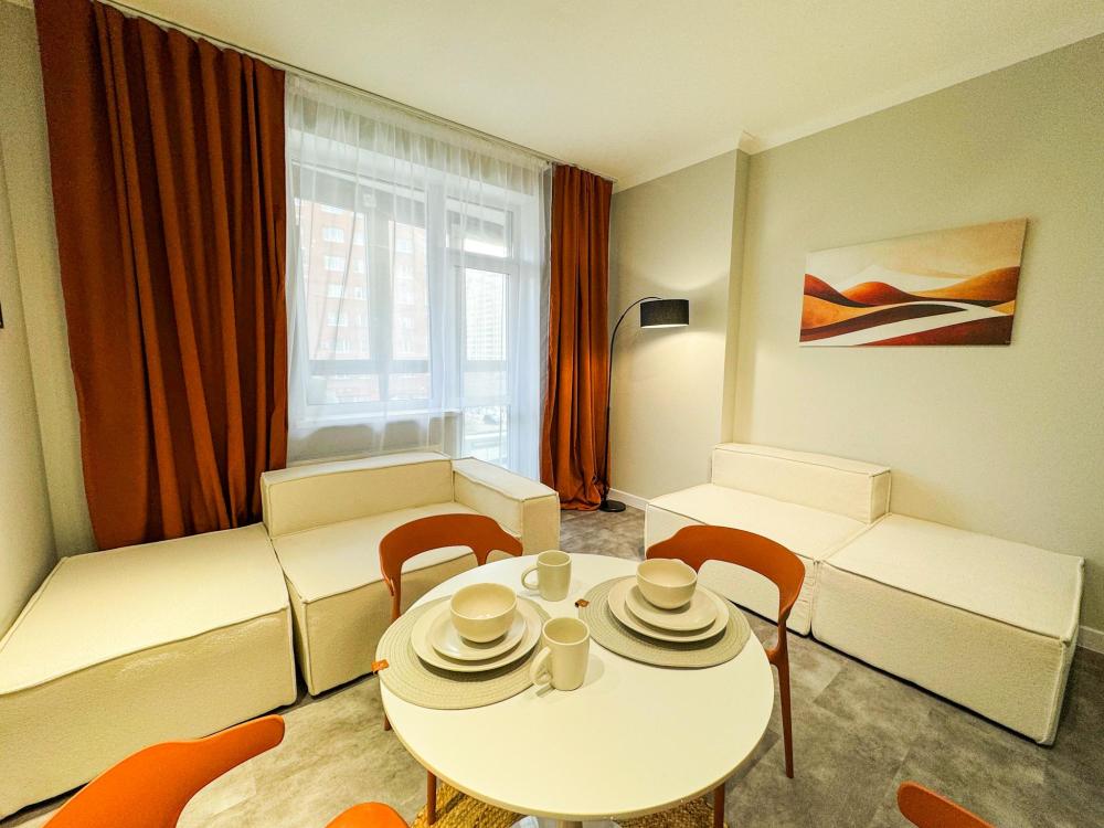 В квартире есть все необходимое, оборудованная кухня, обеденная зона, мебель и бытовая техника (холодильник, телевизор, стиральная машинка автомат, микроволновая печь, чайник, индукционная плита и, вытяжка, утюг, фен, водонагреватель и прочее), безлимитный интернет Wi-Fi и кабельное телевидение, чистые комплекты постельного белья и полотенец для всех проживающих. Предусмотрено все до мелочей. Современный красивый качественный ремонт. Очень чисто и уютно, уборка и смена постельного белья после каждого гостя. Расчетный час по договоренности при длительном заселении Предоставляются отчетные документы Стоимость зависит от сезонности, дат, количества гостей и срока проживания. Условия заселения: предъявление паспорта, военного билета.