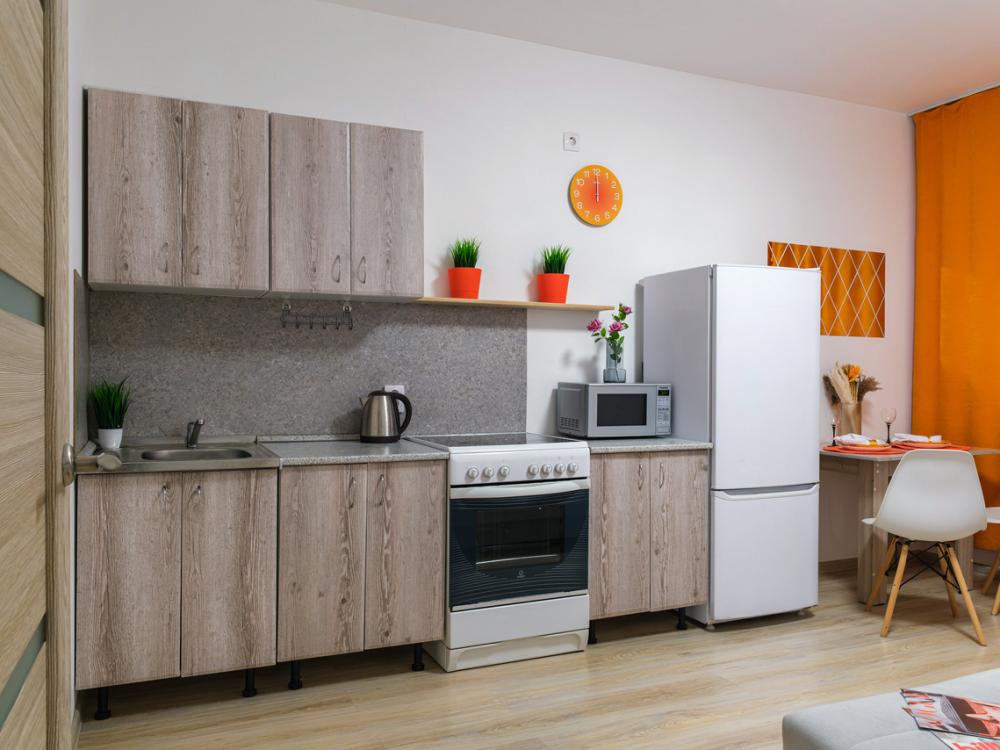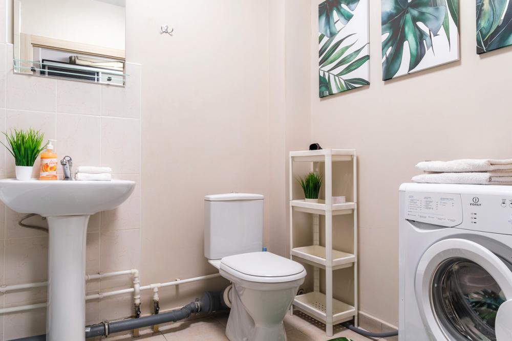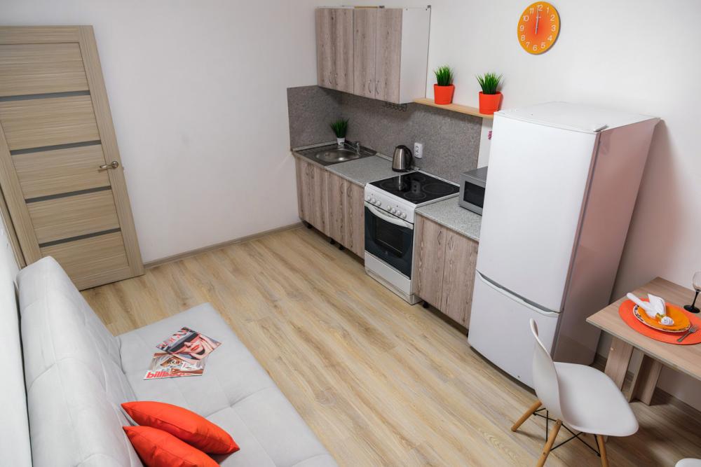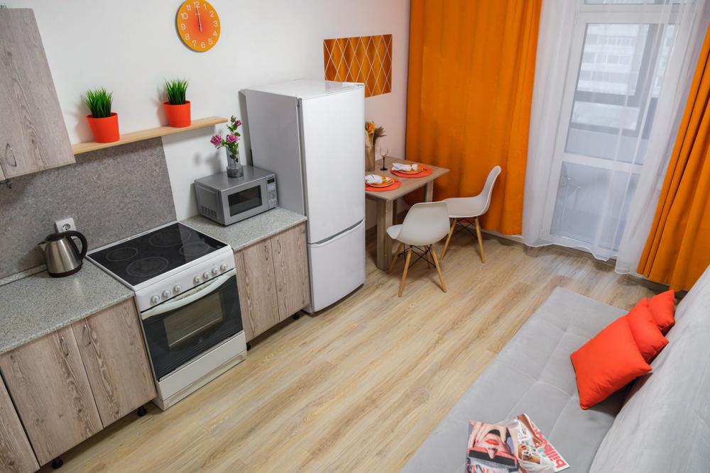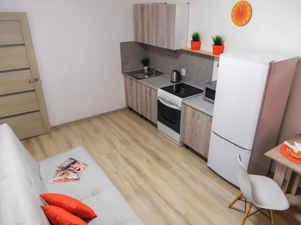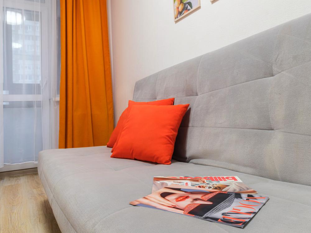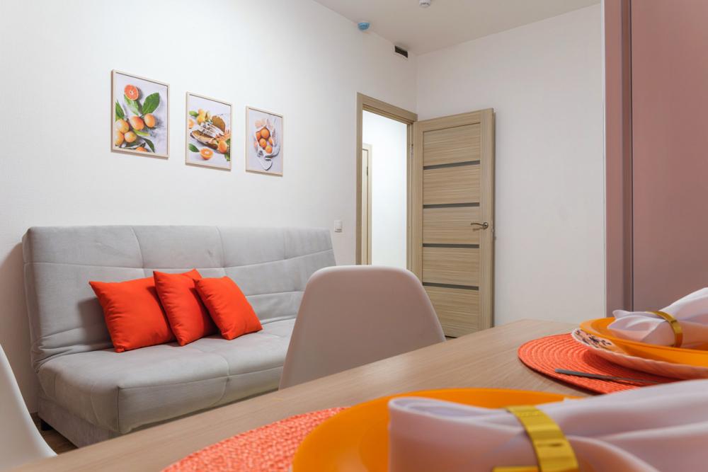 Двухкомнатные апартаменты обставлены со вкусом, новая современная мебель в светлых тонах с яркими акцентами в кухонной и ванной зоне. Апартаменты отлично подходят для проживания до 6 чeловeк. После каждого гостя производится влажная уборка с моющими и дезинфицирующими средствами, тщательное проветривание. Для комфортного пребывания гостей в апартаментах имеется: двуспальная кровать, два двуспальных дивана, чистые постельные принадлежности, чистое постельное белье, свежие полотенца, телевизор и интернет (кабельное TV, Wi-Fi), стиральная машина и сушилка, холодильник, микроволновая печь, электрочайник, вся необходимая посуда для приготовления пищи, духовка и варочная поверхность, фен, утюг и гладильная доска.