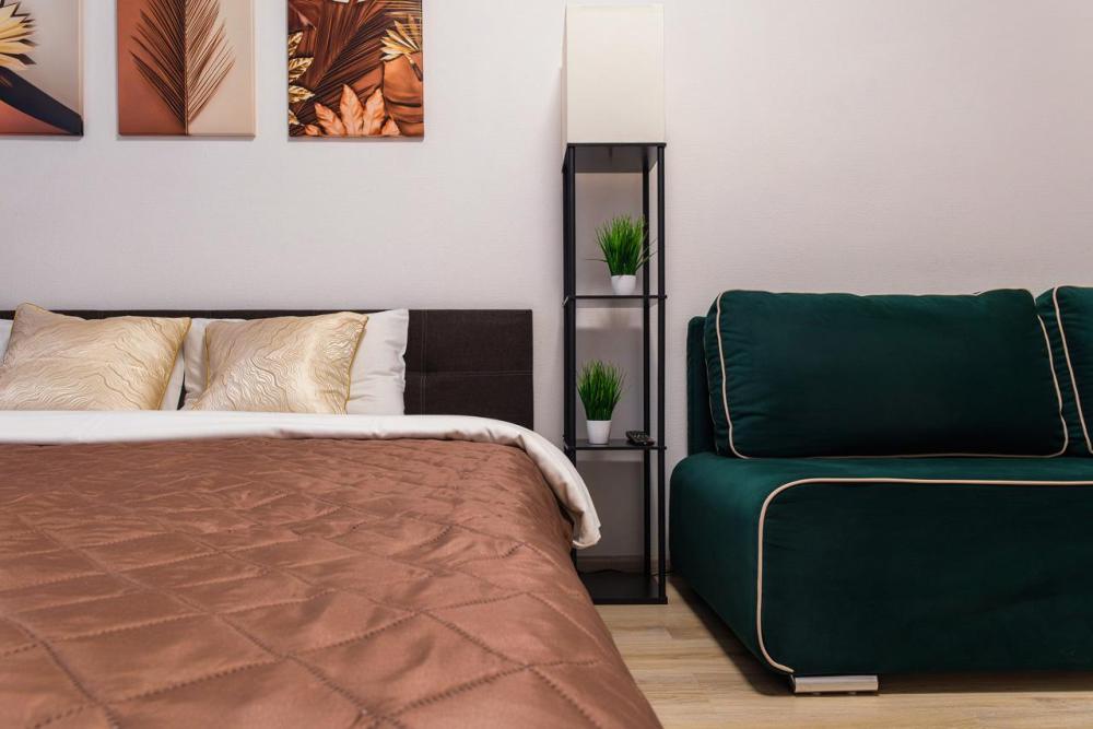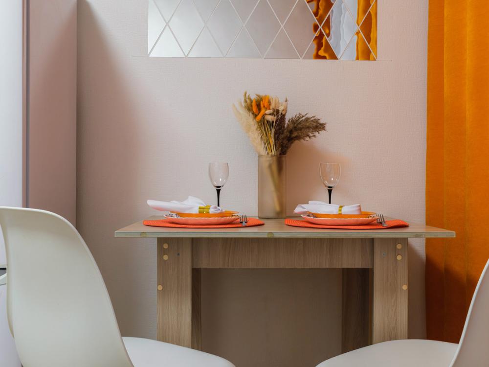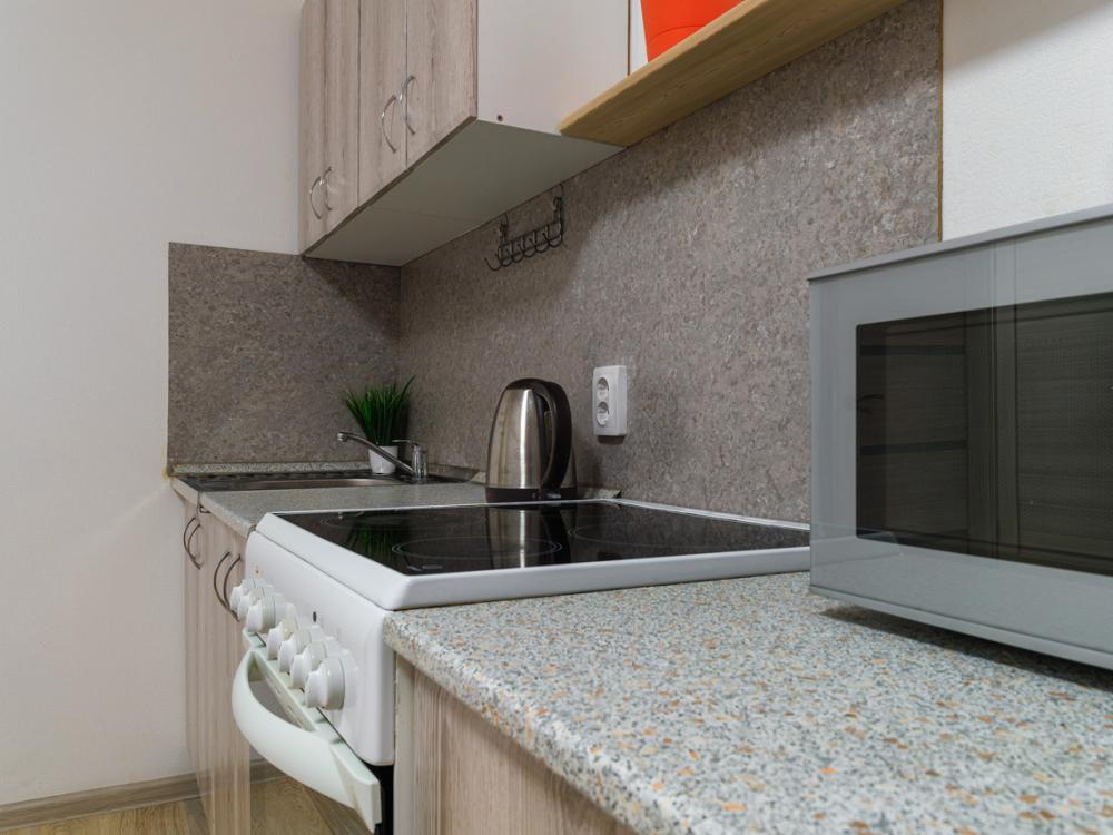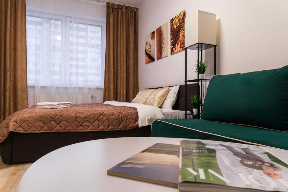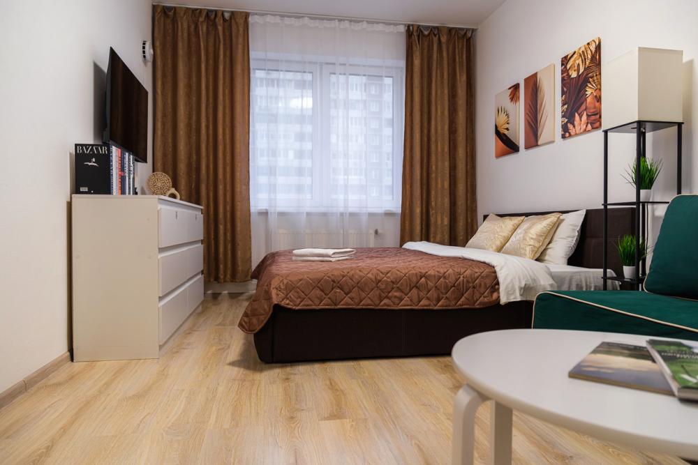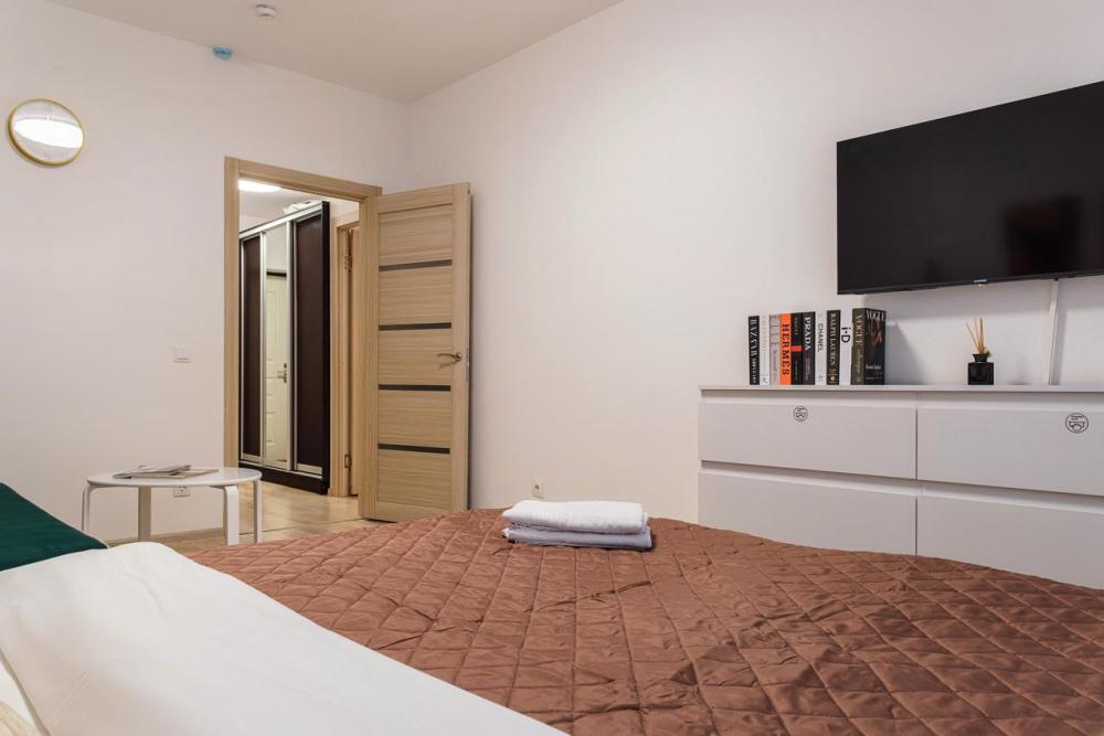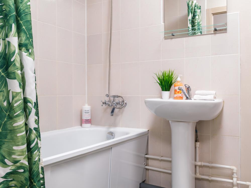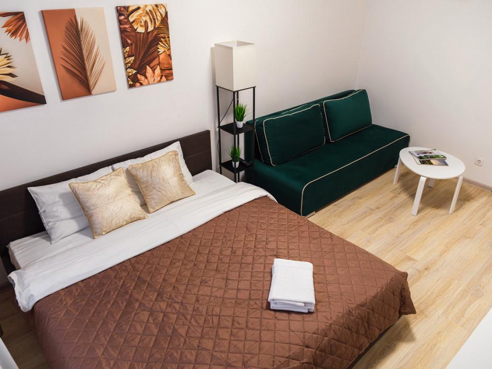 Двухкомнатные апартаменты обставлены со вкусом, новая современная мебель в светлых тонах с яркими акцентами в кухонной и ванной зоне. Апартаменты отлично подходят для проживания до 6 чeловeк. После каждого гостя производится влажная уборка с моющими и дезинфицирующими средствами, тщательное проветривание. Для комфортного пребывания гостей в апартаментах имеется: двуспальная кровать, два двуспальных дивана, чистые постельные принадлежности, чистое постельное белье, свежие полотенца, телевизор и интернет (кабельное TV, Wi-Fi), стиральная машина и сушилка, холодильник, микроволновая печь, электрочайник, вся необходимая посуда для приготовления пищи, духовка и варочная поверхность, фен, утюг и гладильная доска.