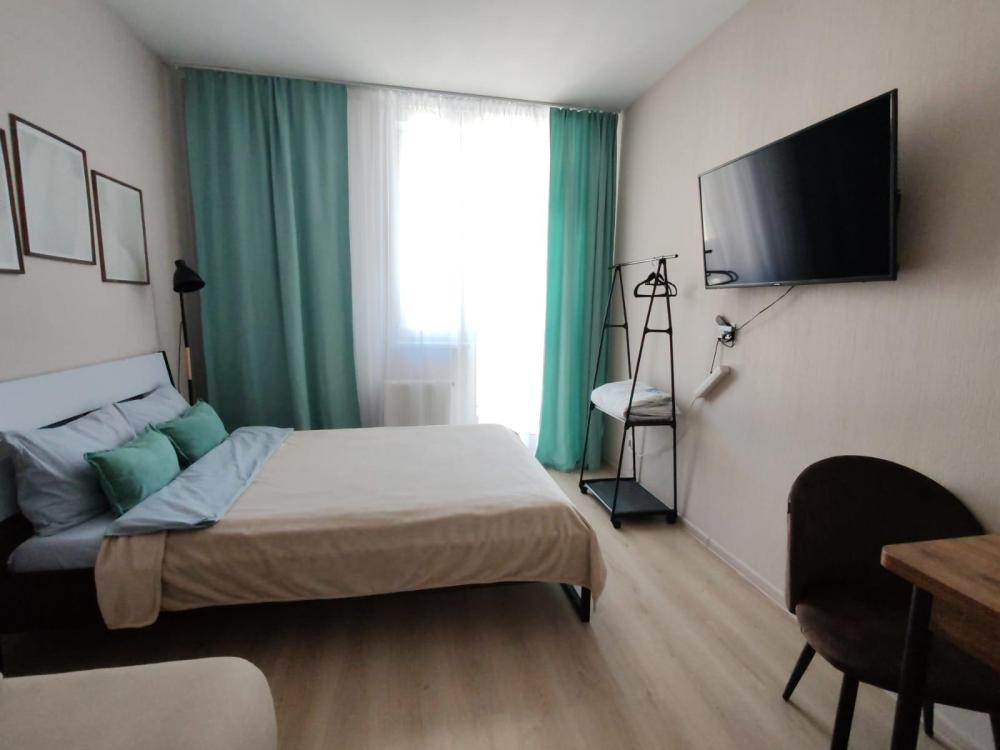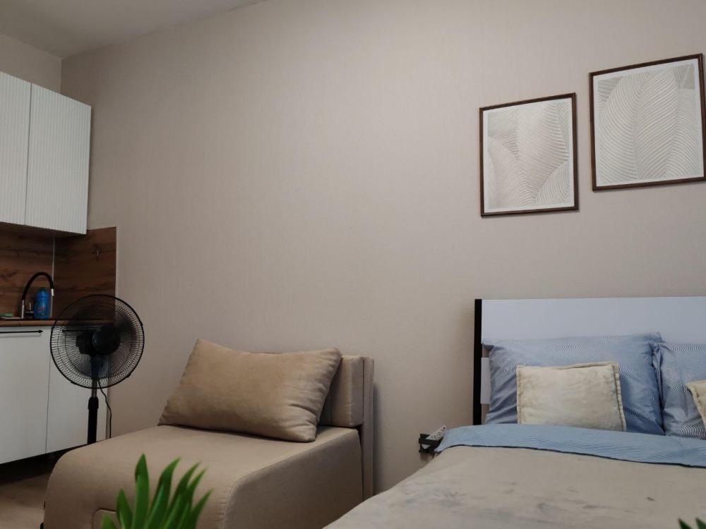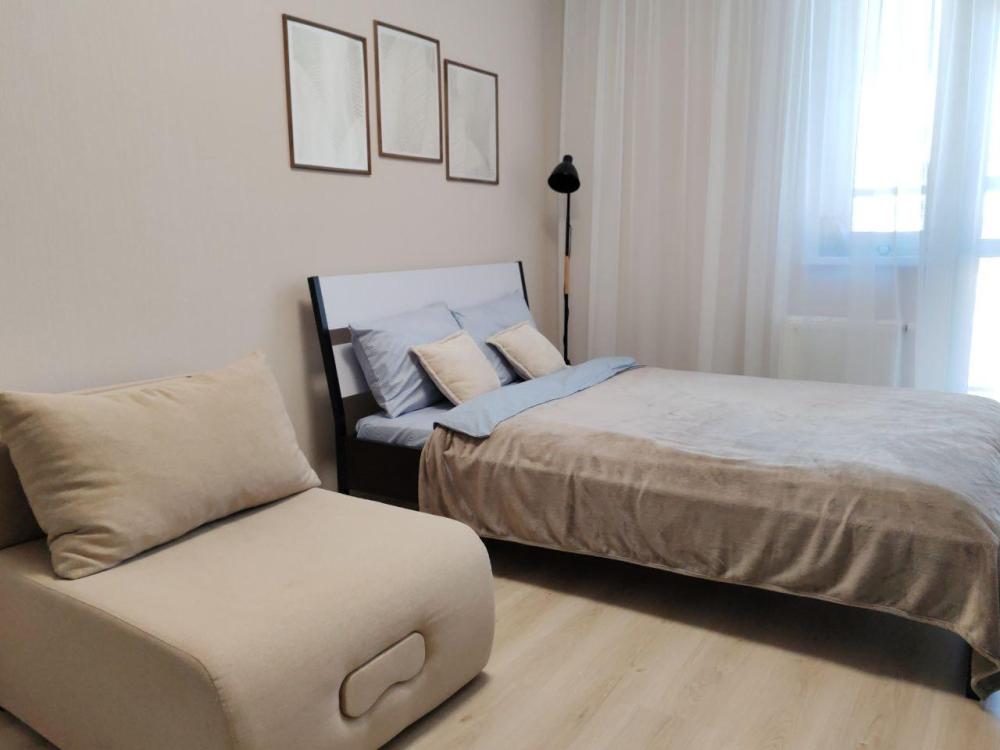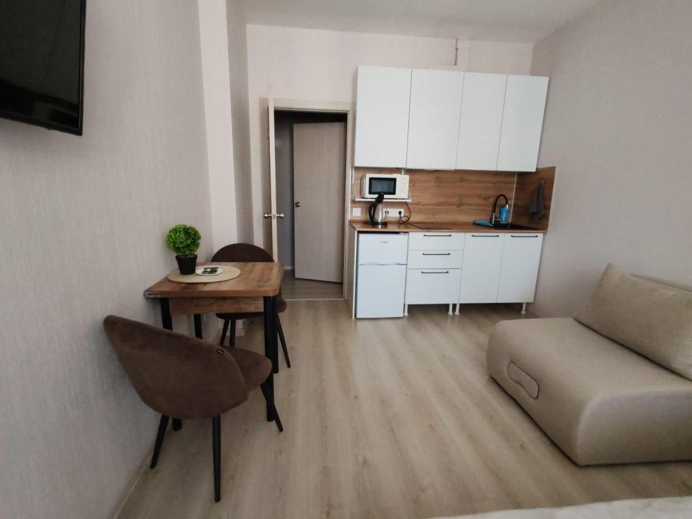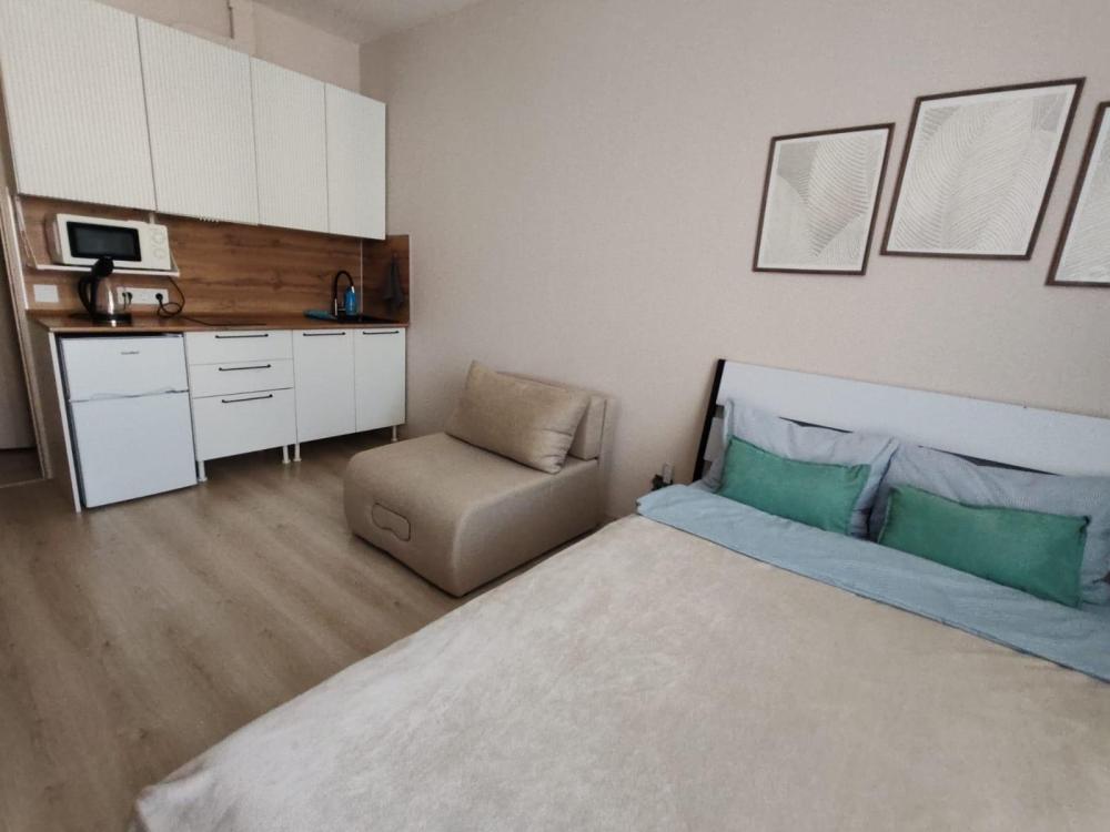 Уютная, светлая студия для проживания 1-2 человек. Удобства в квартирах: двуспальная кровать с ортопедическим матрасом, телевизор с кабельным подключением, бесплатный Wi-Fi, полки и шкаф для хранения личных вещей. На кухне: кухонный гарнитур, СВЧ, холодильник, индукционная плитка, вся необходимая посуда. Ванная комната: ванна/душ, стиральная машина.
