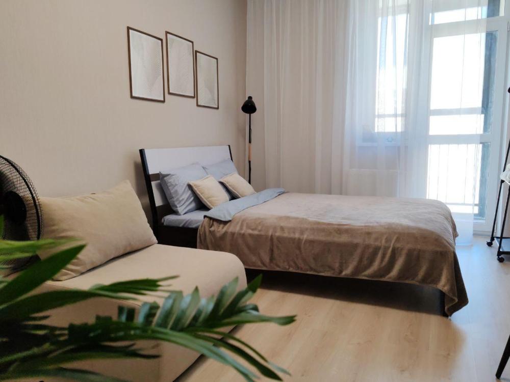 Уютная, светлая студия для проживания 1-2 человек. Удобства в квартире: две односпальные кровати с ортопедическим матрасом, телевизор с кабельным подключением, бесплатный Wi-Fi, полки и шкаф для хранения личных вещей. На кухне: кухонный гарнитур, СВЧ, холодильник, индукционная плитка, вся необходимая посуда. Ванная комната: ванна, стиральная машина.