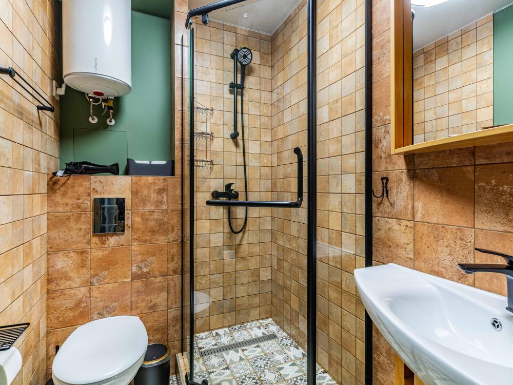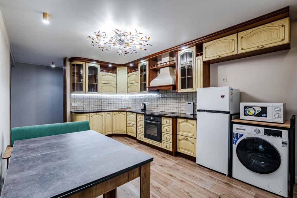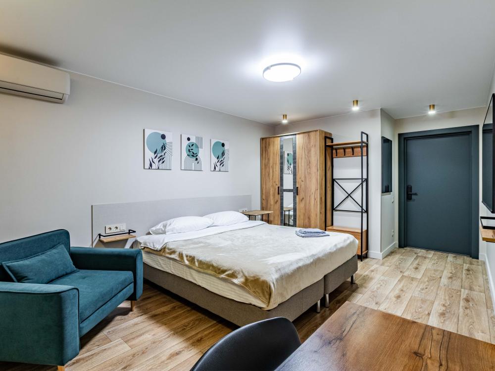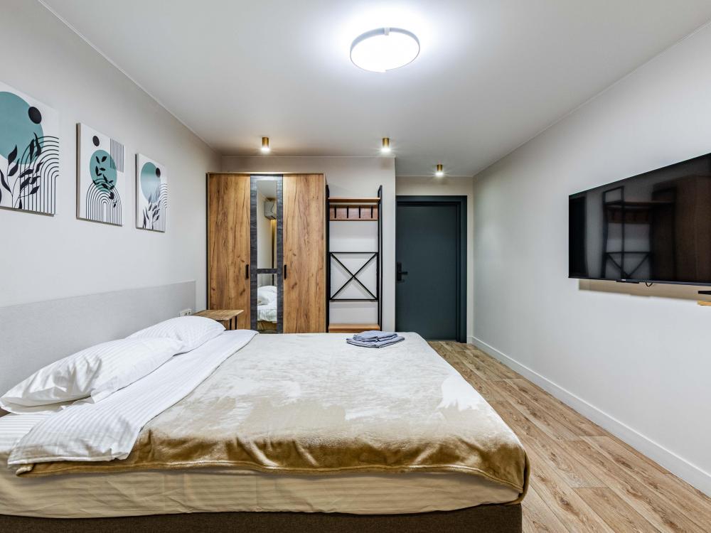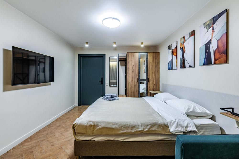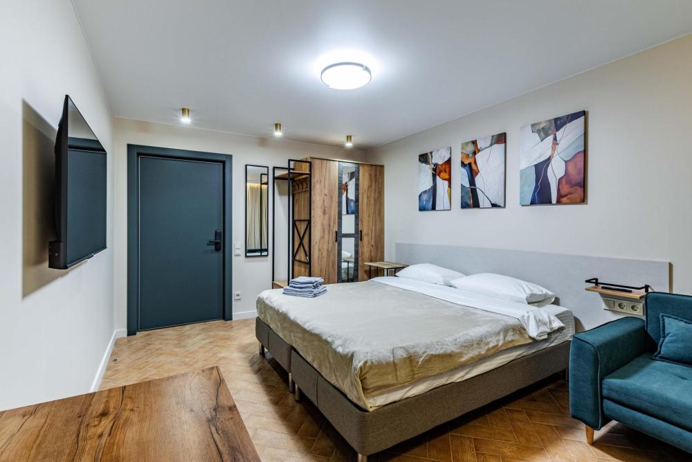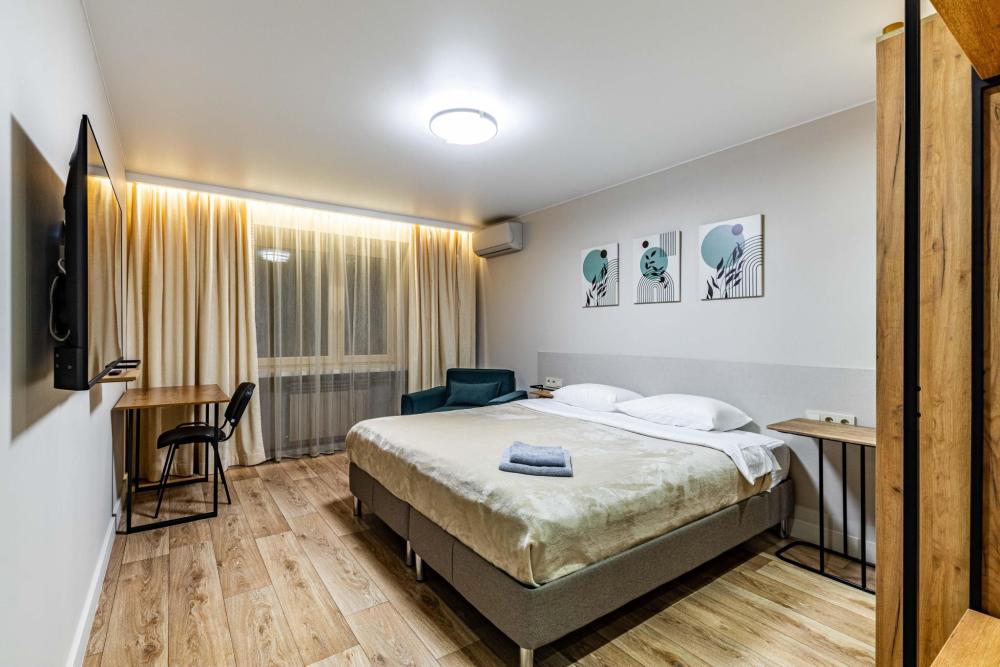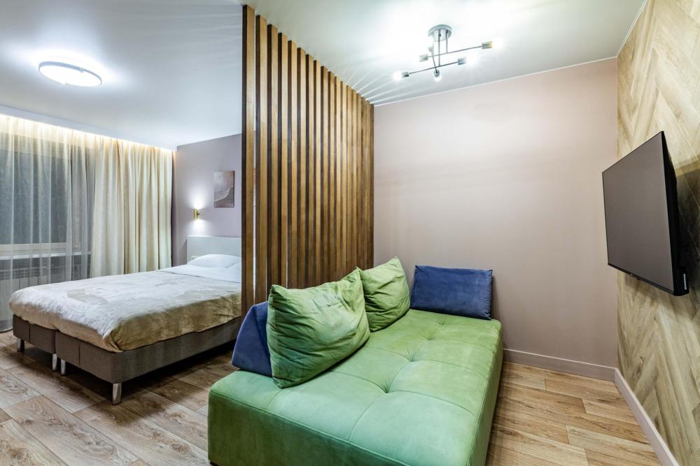 Комната-студия в трехкомнатной квартире. Для комфортного проживания в квартире имеется все необходимое: двуспальная кровать, диван-кровать, шкаф, телевизор, утюг, гладильная доска, wi-fi. Квартира оснащена кухней и двумя общими ванными комнатами