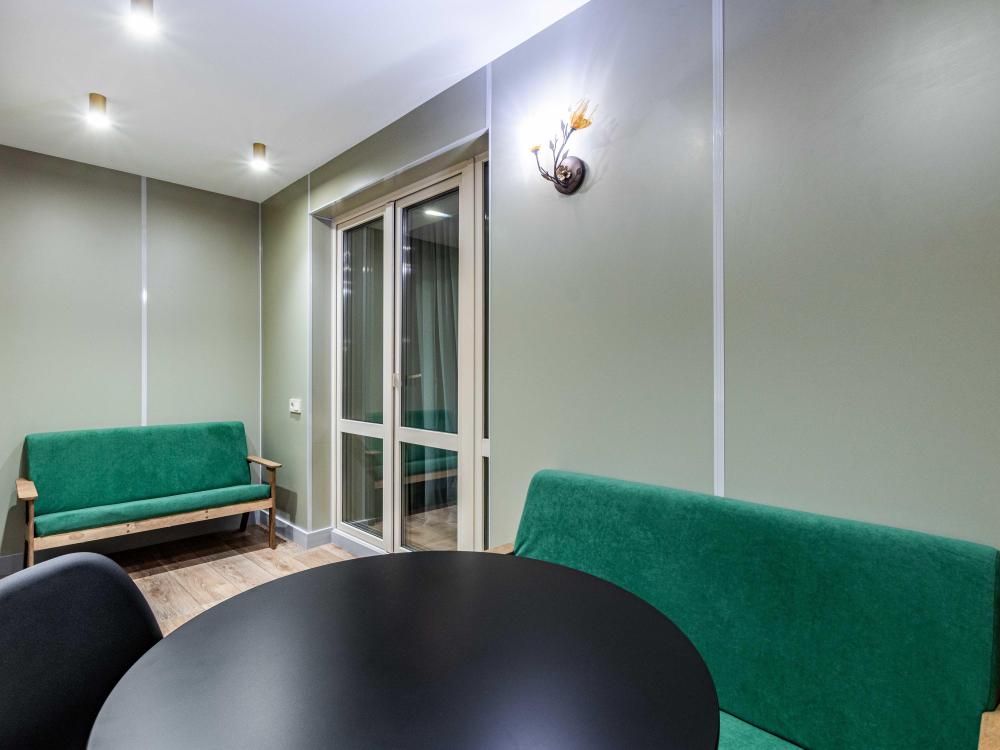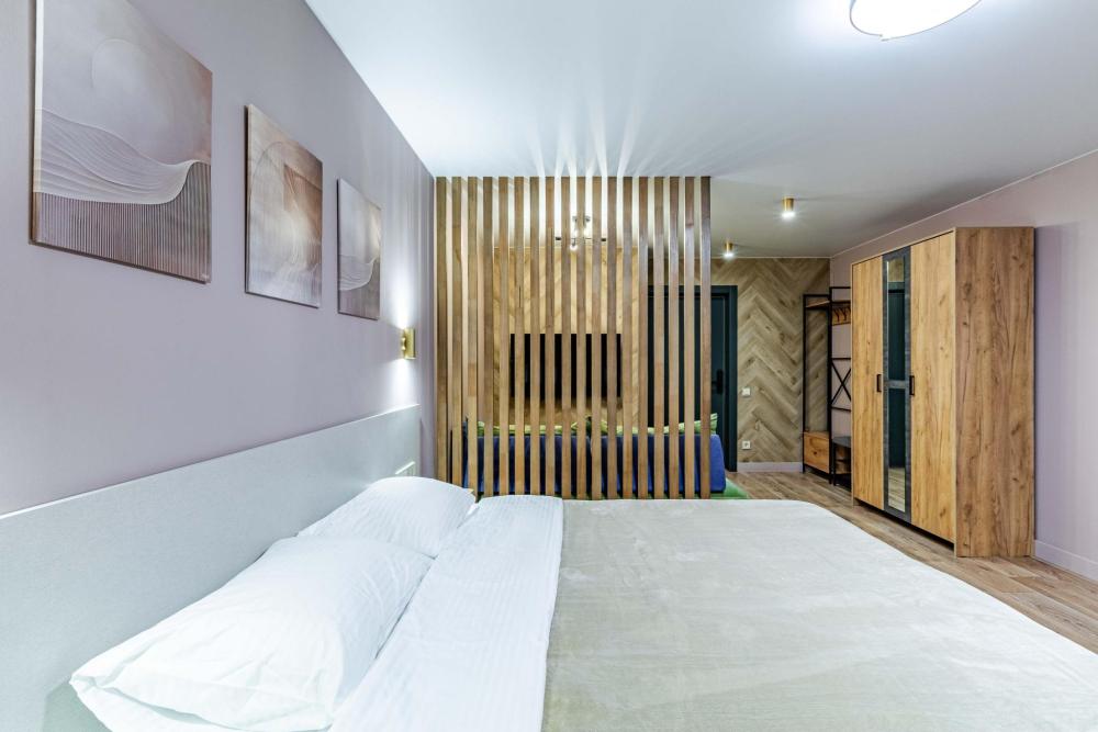 Комната-студия в трехкомнатной квартире. Для комфортного проживания: двуспальная кровать, раскладной диван, шкаф, телевизор, утюг, гладильная доска, wi-fi, оборудованная кухня с плитой , духовкой и посудомоечной машиной, посуда для приготовления, постельное белье, полотенца, приветственный гигиенический набор, чайный набор, фен, кресло-кровать. Квартира оснащена общей кухней и двумя общими ванными комнатами