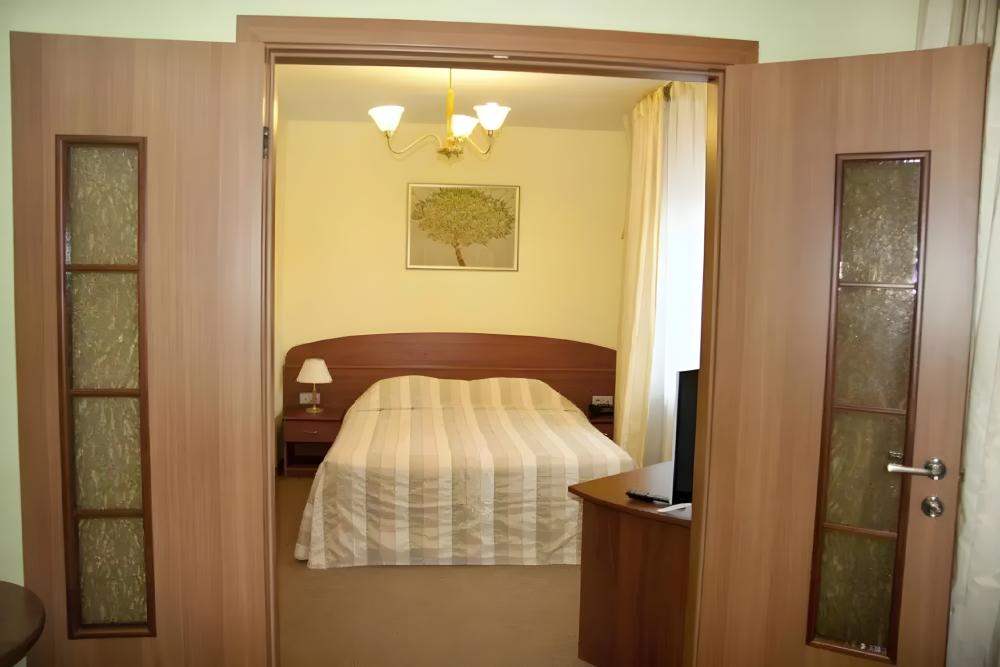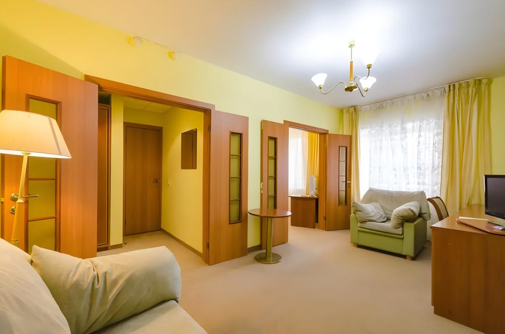 В номере: Двуспальная кровать, двуспальный диван, шкаф-купе, фен, набор для ванны, халат, тапочки, кондиционер, электрический чайник, сейф, телефон, Выход в Интернет Wi - Fi,