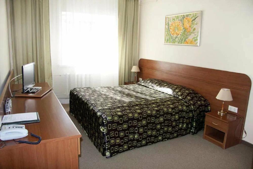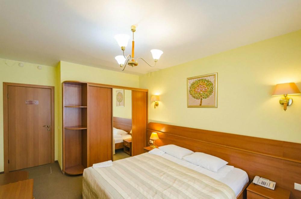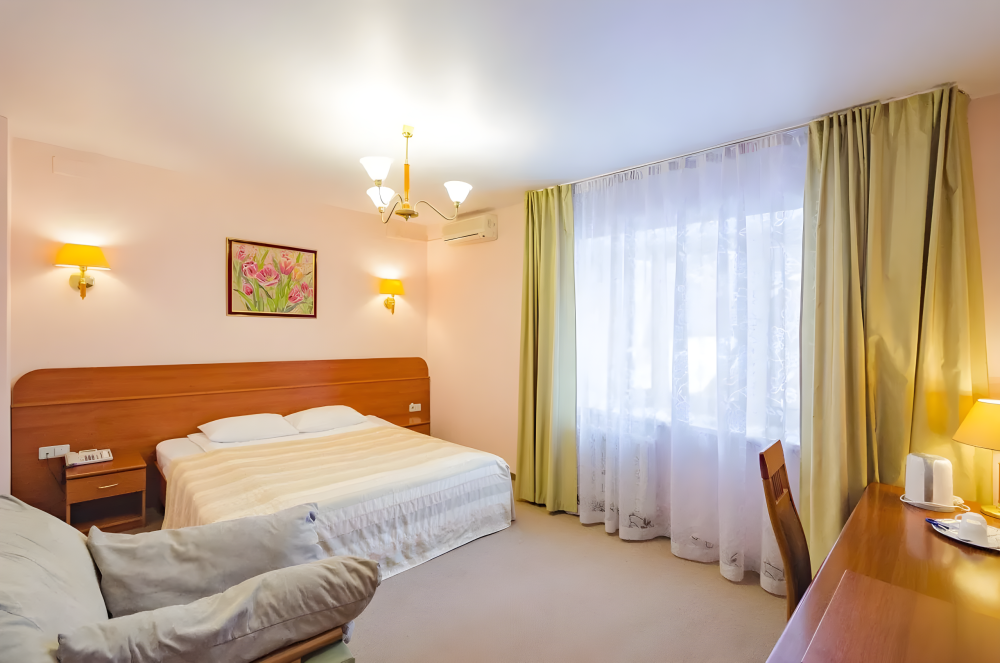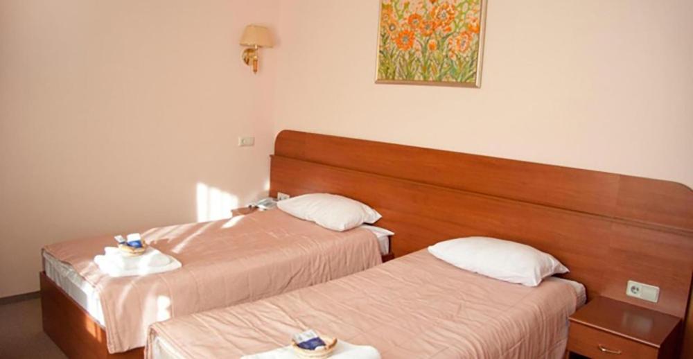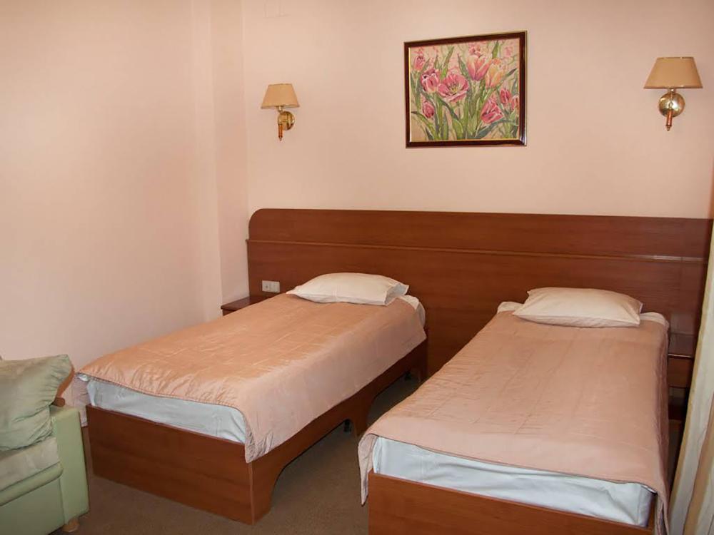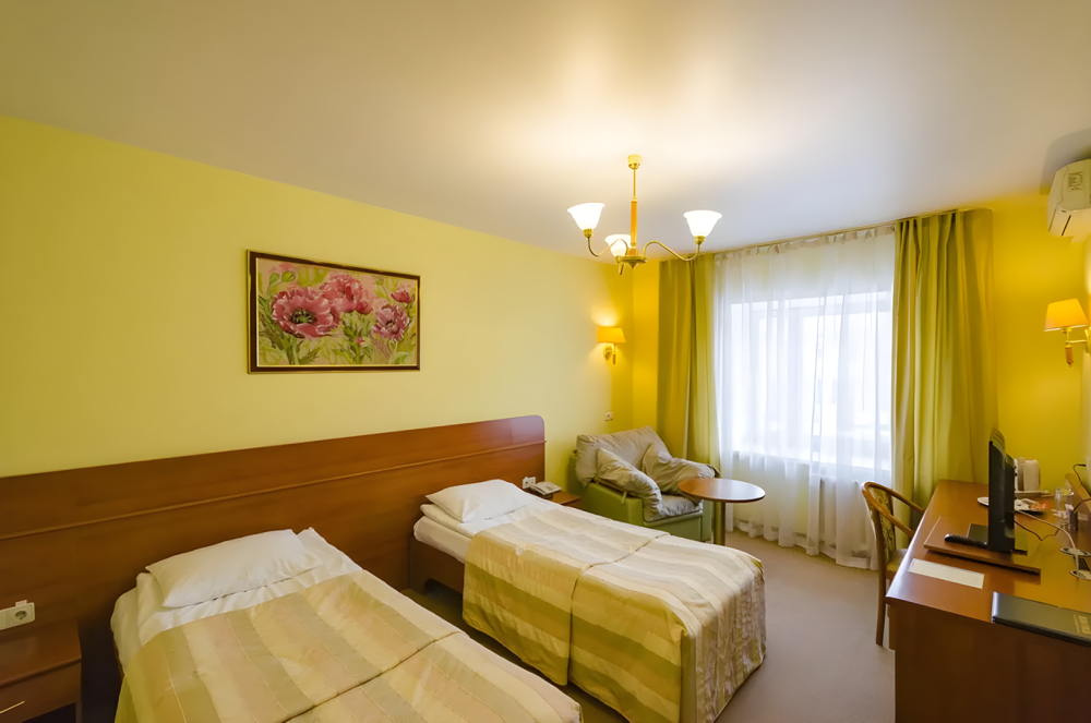 В номере: две односпальные, кровати шкаф-купе, письменный стол, фен, набор для ванны, кондиционер, сейф,телефон, выход в Интернет Wi - Fi , электрический чайник. На фото представлены варианты номером категории "Стандарт".