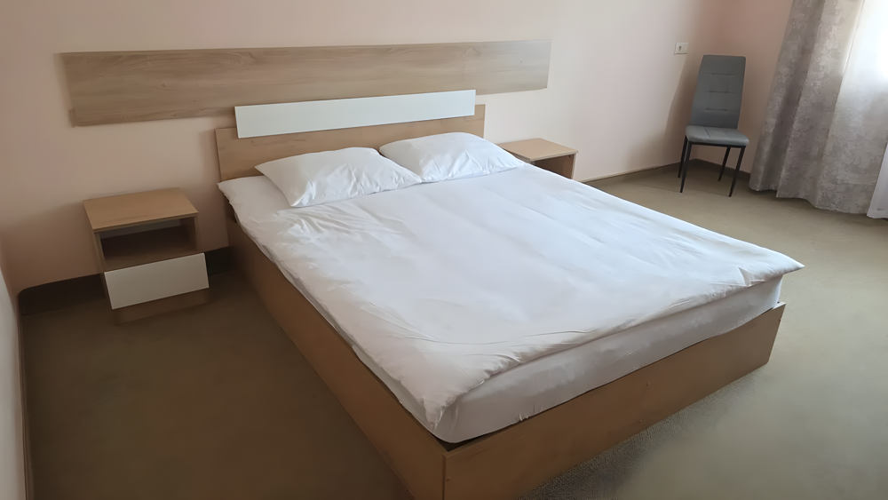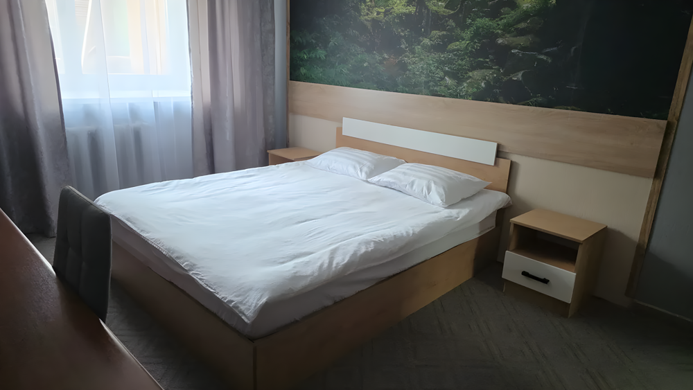Эконом с двуспальной кроватью (без удобств) Номер 13 м². Двуспальная кровать (160×200 см) с ортопедическим матрасом. Wi-Fi, шкаф, прикроватные тумбочки. Санузел и душ — общие на этаже (чистые, рядом). Тихий номер с видом во двор.