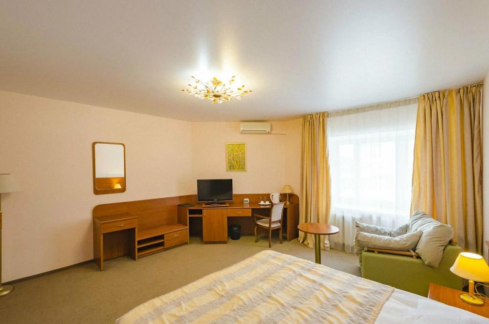 В номере: одна двуспальная кровать , шкаф-купе, письменный стол, фен, набор для ванны, кондиционер, сейф,телефон, выход в Интернет Wi - Fi , электрический чайник. На фото представлены варианты номеров категории "Стандарт".