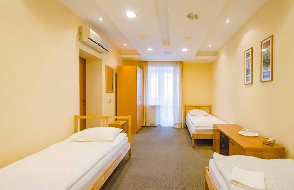 Номер категории «Эконом», 13 м². Три односпальные кровать, ортопедический матрас. Wi-Fi, прикроватные тумбочки. Санузел и душ — общие на этаже. Спокойное расположение, приятное оформление.