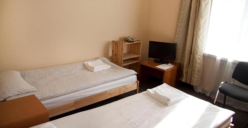 Номер категории «Эконом», 13 м². Две односпальные кровати, ортопедический матрас. Wi-Fi, шкаф, прикроватные тумбочки. Санузел и душ — общие на этаже. Спокойное расположение, приятное оформление.
