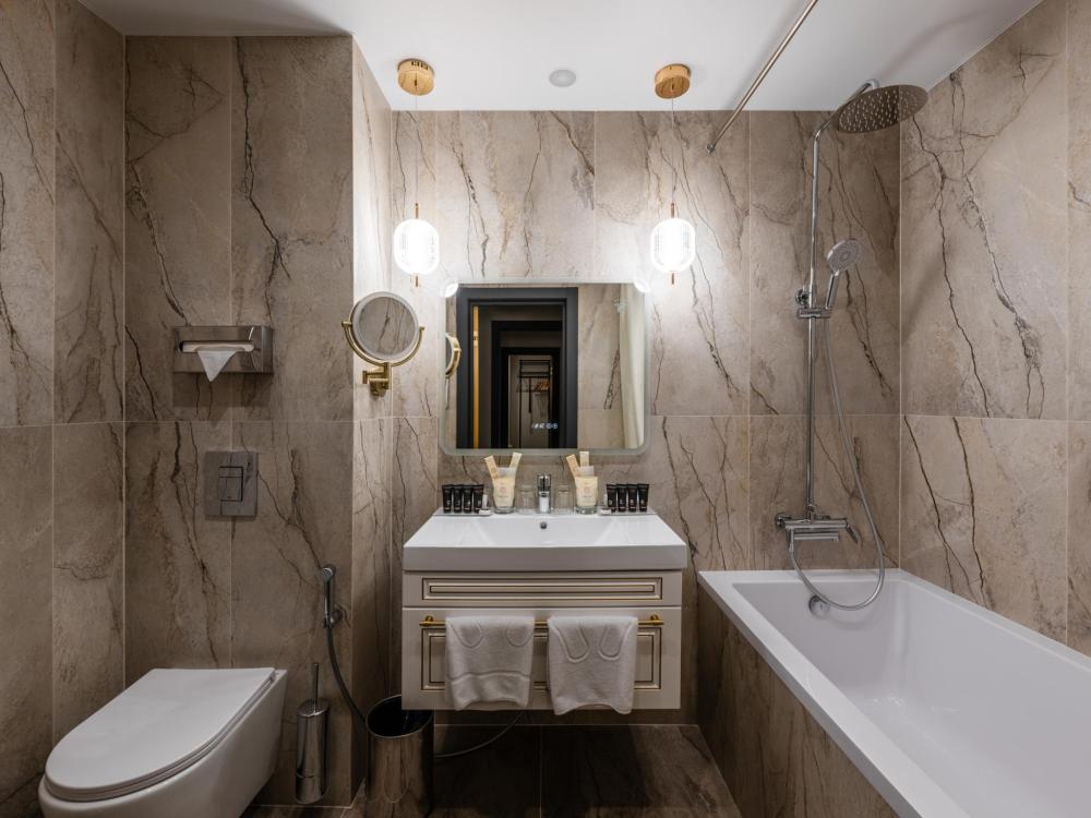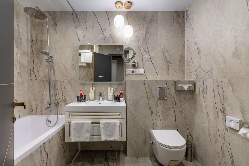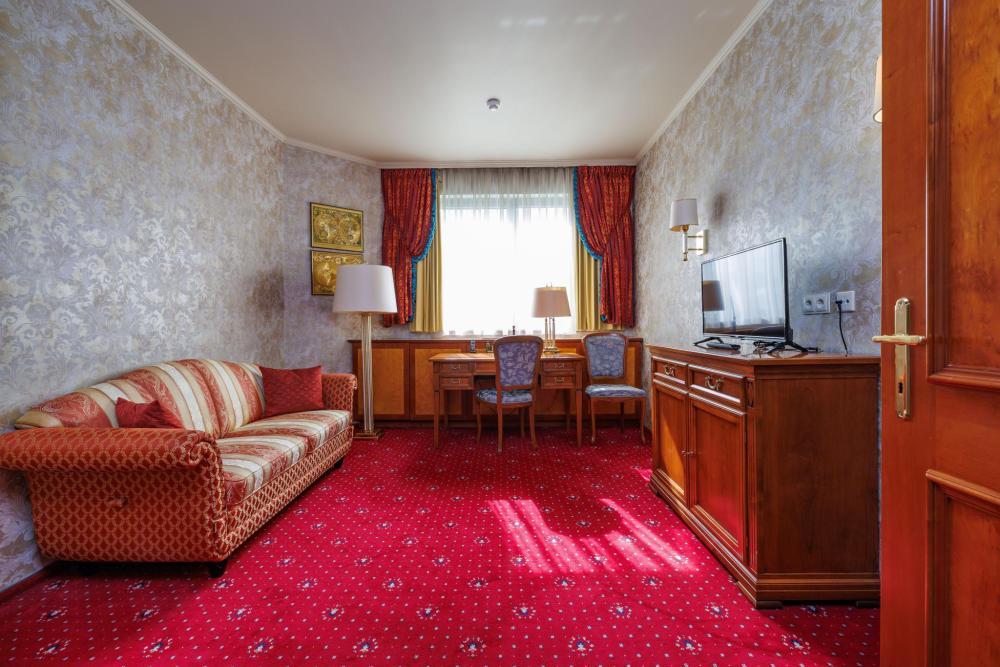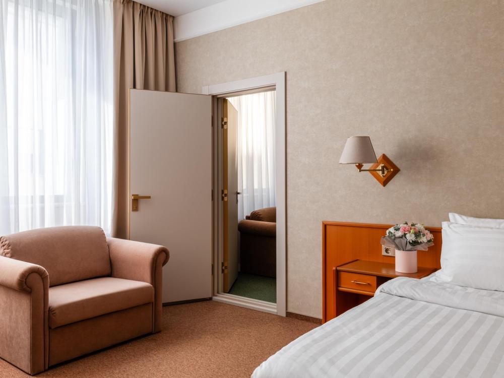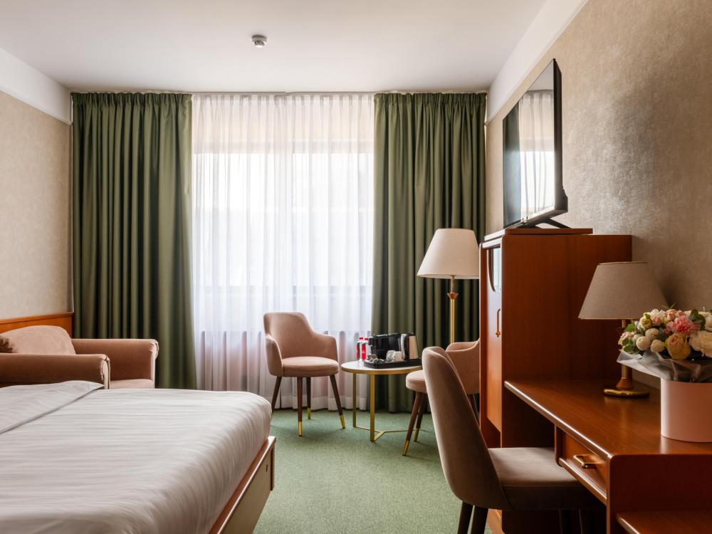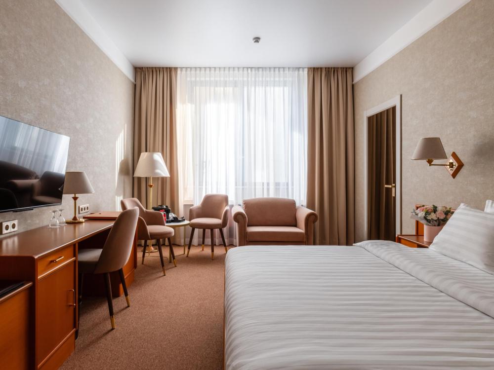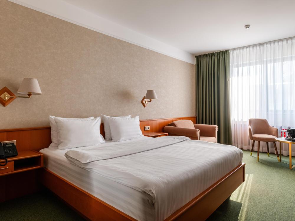 Уютный однокомнатный номер площадью 33 кв. м. с большой двуспальной кроватью и креслом-кроватью. В каждом номере: спутниковое телевидение (20 каналов), мини-бар (за дополнительную плату), рабочий стол, сейф. В прихожей: гардероб, бланк-заказ для прачечной, мешок для сдачи белья в прачечную и химчистку, швейный набор, щетка, губка и рожок для обуви, тапочки. В ванной комнате: ванна, раковина, гигиенический душ, унитаз, зеркало, увеличивающее зеркало для бритья, фен, диспансер с жидким мылом, халат, банное полотенце 2 шт., полотенце для рук 2 шт., полотенце для ног, набор одноразовой продукции.