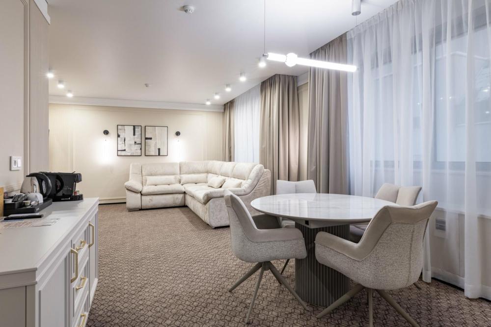 Комфортабельные трехкомнатные апартаменты (2 спальные комнаты с двуспальными кроватями и гостиная либо 1 спальная комната, гостиная и кабинет) площадью 88 кв. м. идеально подходят для отдыха и деловых встреч. В номере: 3 телевизора (спутниковое телевидение-20 каналов, мини-бар (за дополнительную плату), рабочий стол, сейф. В гостиной: раскладной диван и шкаф с набором запасного постельного белья. В прихожей: гардероб, бланк-заказ для прачечной, мешок для использованного белья, швейный набор, щетка, губка и рожок для обуви, тапочки. Туалетная комната для гостей: унитаз, раковина, полотенце для рук. В ванной комнате: ванна, раковина, унитаз, биде, зеркало, увеличивающее зеркало для бритья, фен, набор полотенец на 2 человека (банное полотенце 2 шт., полотенце для рук 2 шт., полотенце для ног), 2 халата, набор одноразовой продукции.