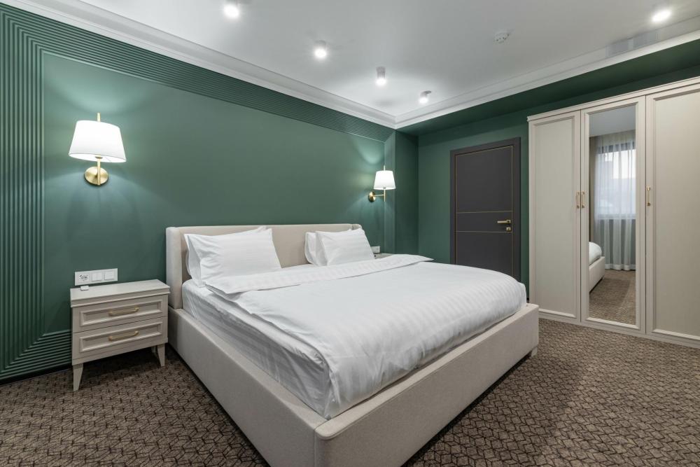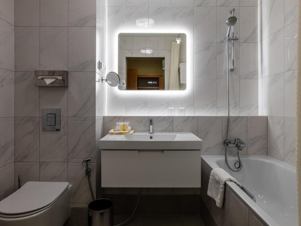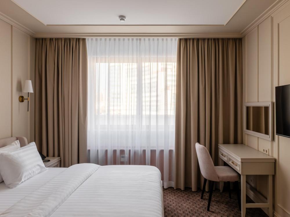Уютный однокомнатный номер площадью 25 кв. м. с большой двуспальной кроватью, располагающий всем для комфортного проживания и работы. В каждом номере: спутниковое телевидение, рабочий стол, сейф. В прихожей: гардероб, бланк-заказ для прачечной, мешок для сдачи белья в прачечную и химчистку, швейный набор, щетка, губка и рожок для обуви, тапочки. В ванной комнате: ванна, раковина, гигиенический душ, унитаз, зеркало, увеличивающее зеркало для бритья, фен, диспансер с жидким мылом, халат, банное полотенце 2 шт., полотенце для рук 2 шт., полотенце для ног, набор одноразовой продукции питьевая вода.