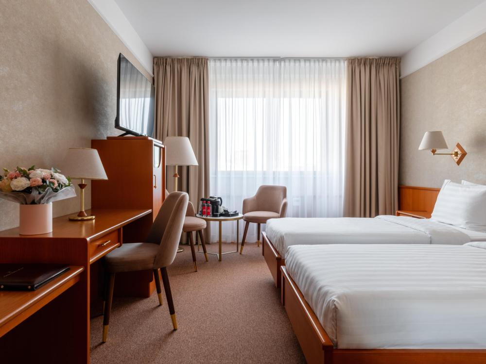 Уютный однокомнатный номер площадью 25 кв. м. с двумя односпальными кроватями. В каждом номере: спутниковое телевидение (20 каналов), мини-бар (за дополнительную плату), рабочий стол, сейф. В прихожей: гардероб, бланк-заказ для прачечной, мешок для сдачи белья в прачечную и химчистку, швейный набор, щетка, губка и рожок для обуви, тапочки. В ванной комнате: ванна, раковина, гигиенический душ, унитаз, зеркало, увеличивающее зеркало для бритья, фен, диспансер с жидким мылом, халат, банное полотенце 2 шт., полотенце для рук 2 шт., полотенце для ног, набор одноразовой продукции (гель для душа, шампунь, лосьон для тела, шапочка для душа, мыло, набор для гигиены полости рта, расческа), питьевая вода. Смена постельного белья ежедневно.