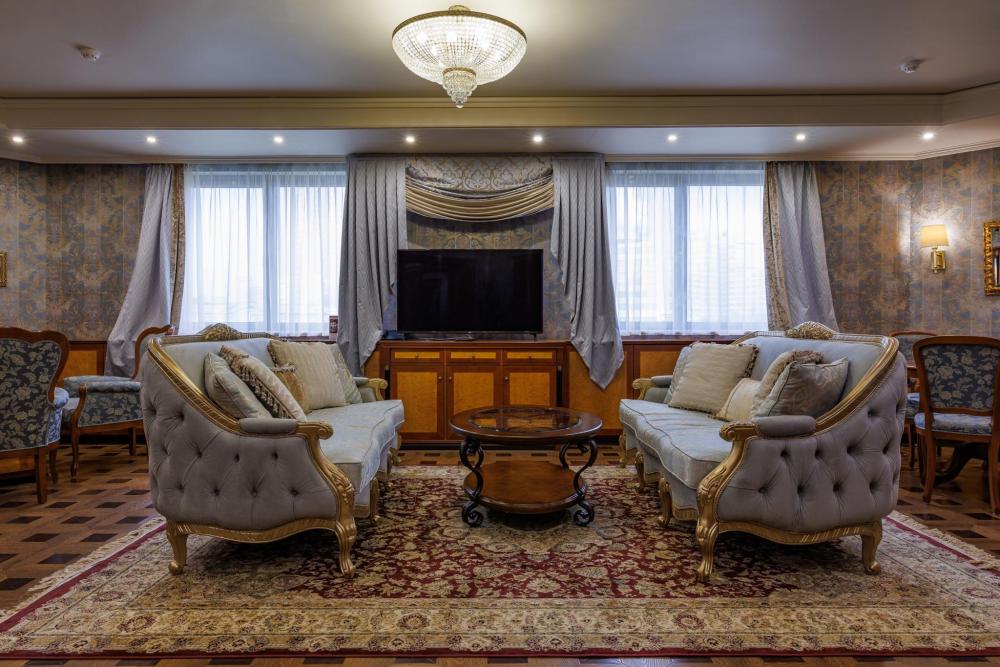 Трехкомнатные апартаменты: гостиная, спальная комната и кабинет. В номере в каждой комнате ж/к телевизор, мини-бар, телефон, сейф, весы, халат, комплект полотенец, тапочки. Смена постельного белья каждый день.
