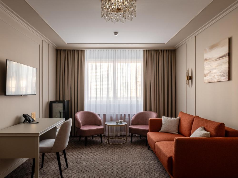Прекрасные двухкомнатные апартаменты (гостиная и спальная комната с двуспальной кроватью), площадью 55 кв. м., идеально подходят для длительного проживания. В номере: 2 телевизора (спутниковое телевидение-20 каналов, мини-бар (за дополнительную плату), рабочий стол, сейф. В гостиной: раскладной диван и шкаф с набором запасного постельного белья и дополнительным одеялом. В прихожей: гардероб, бланк-заказ для прачечной, мешок для сдачи белья в химчистку и прачечную, швейный набор, щетка, губка и рожок для обуви, тапочки. Туалетная комната для гостей: унитаз, раковина, полотенце для рук. В ванной комнате: ванна, раковина, унитаз, биде, зеркало, увеличивающее зеркало для бритья, фен, набор полотенец на 2 человека (банное полотенце 2 шт., полотенце для рук 2 шт., полотенце для ног), 2 халата, набор одноразовой продукции.
