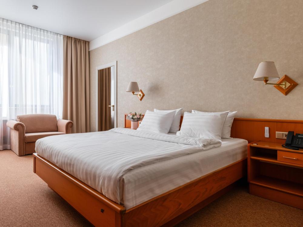 Уютный однокомнатный номер площадью 25 кв. м. с большой двуспальной кроватью, располагающий всем для комфортного проживания и работы. В каждом номере: спутниковое телевидение (20 каналов), мини-бар (за дополнительную плату), рабочий стол, сейф. В прихожей: гардероб, бланк-заказ для прачечной, мешок для сдачи белья в прачечную и химчистку, швейный набор, щетка, губка и рожок для обуви, тапочки. В ванной комнате: ванна, раковина, гигиенический душ, унитаз, зеркало, увеличивающее зеркало для бритья, фен, диспансер с жидким мылом, халат, банное полотенце 2 шт., полотенце для рук 2 шт., полотенце для ног, набор одноразовой продукции (гель для душа, шампунь, лосьон для тела, шапочка для душа, мыло, набор для гигиены полости рта, расческа), питьевая вода. Смена постельного белья ежедневно.