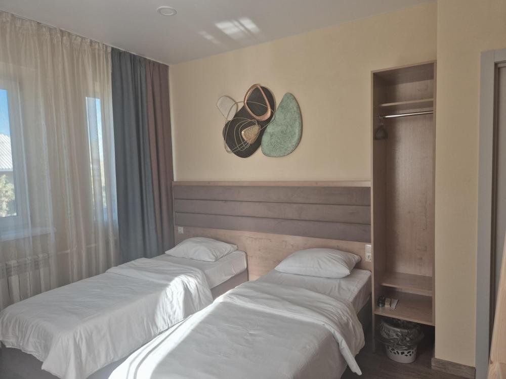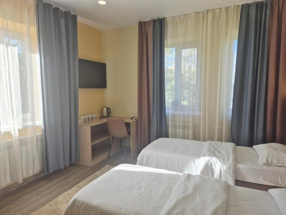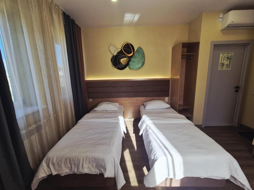 Светлый, теплый, уютный номер с двумя односпальными кроватями или одной двуспальной кроватью, с ортопедическими матрасами. Собственный туалет и душ. Размер односпальных мест 800*2000, размер двуспальной кровати 160*200 Ночное освещение и розетки у каждого спального места, открытый шкаф для хранения вещей, обеденный стол и стулья. Номер оборудован телевизором, мини холодильником и кондиционером. Стиральная машина расположена в холле отеля и доступна для гостей, всю информацию по дополнительным услугам можно получить у администратора.