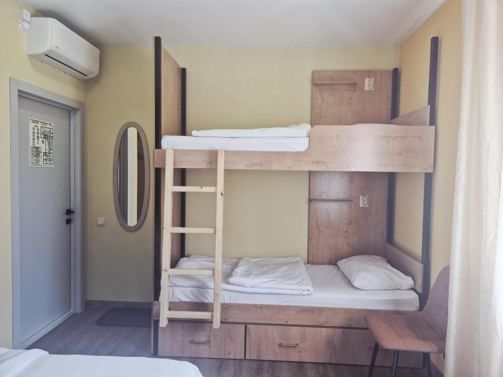 Уютный и светлый номер, вместимостью до3х человек. В номере стоит двуярусная кровать, нижнее место 140*200 для 2х человек, верхний ярус 80*200. В номере есть smart TV, тумбочка комод, письменный стол, стулья, вешалка для верхней одежды. На зоне ресепшена можно купить товары первой необходимости, воспользоваться микроволновой печью, чайником, холодильником. Душ и туалет рассчитаны на 3 номера.