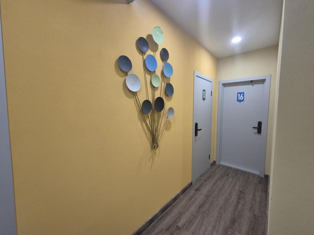 Номер с двуспальной кроватью и индивидуальным сан.узлом, телевизором и кондиционером. Размер спального места 1600*2000. Есть индивидуальное освещение и розетки, шкаф-купе для хранения вещей, выдвижные ящики в корпусе кровати, обеденный стол и стулья. Кухня оснащена раковиной, варочной поверхностью, чайником и необходимой посудой. Холодильник и стиральная машина расположена в холле и используется для 4х номеров.