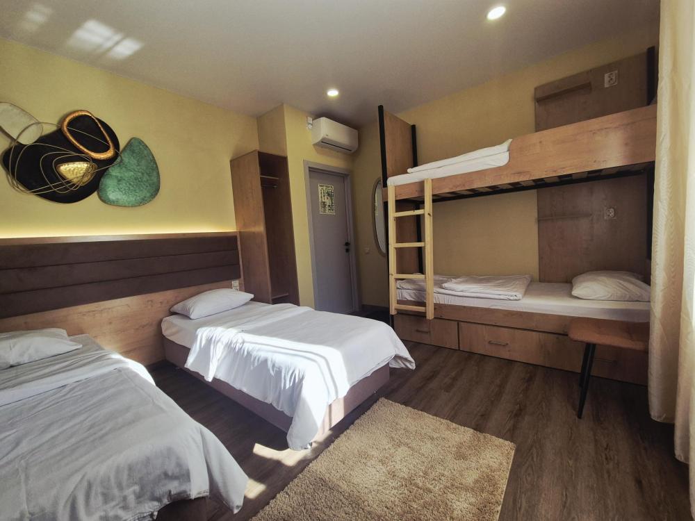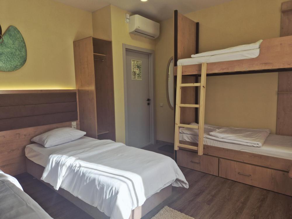 Уютный семейный номер с двухъярусной кроватью и двумя односпальными или одной двуспальной кроватью. В номере есть телевизор со SMART TV, холодильник, чайник, чайные принадлежности, кондиционер, электронный замок, москитные сетки на окнах. Душ и туалет общий на 2 номера в блоке