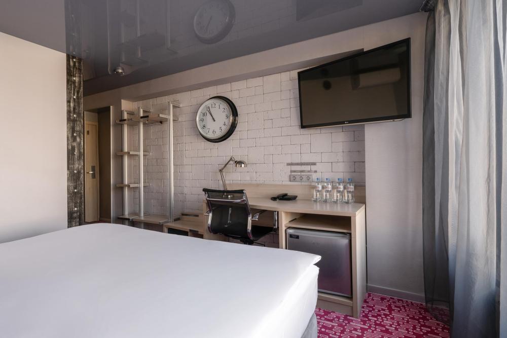 Номер Стандарт улучшенный с двуспальной кроватью оснащен рабочей зоной, сейфом, большим плазменным телевизором с цифровым телевидением. Сан. узел оборудован душевой кабиной, туалетом и феном. Все гигиенические принадлежности (полотенца, тапочки, гель для душа, шампунь, зубной и бритвенный набор, мыло, косметический набор) имеются в номере.