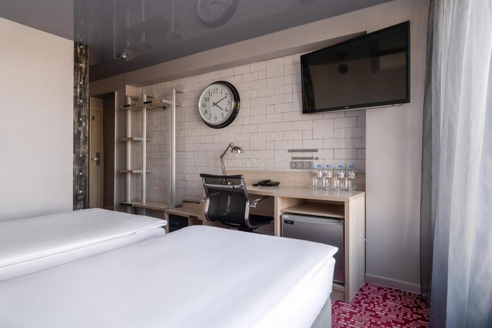 В номере: кровати с ортопедическим матрасом; гипоаллергенное постельное бельё (100% хлопок). вместительный гардероб и большое зеркало; мягкие махровые полотенца; телевизор; телефон, междугородняя/международная связь; холодильник/морозильная камера; домашние тапочки; щетка для одежды/обуви; ванная комната с душем; косметика для ванны и душа: мыло, шампунь, гель для душа, гель для бритья, зубной набор.