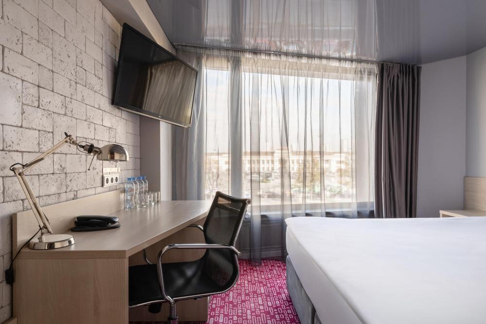 Номер Стандарт улучшенный с двуспальной кроватью оснащен рабочей зоной, сейфом, большим плазменным телевизором с цифровым телевидением. Сан. узел оборудован душевой кабиной, туалетом и феном. Все гигиенические принадлежности (полотенца, тапочки, гель для душа, шампунь, зубной и бритвенный набор, мыло, косметический набор) имеются в номере. Завтраки и ужины сервируются в формате "Шведский Стол".