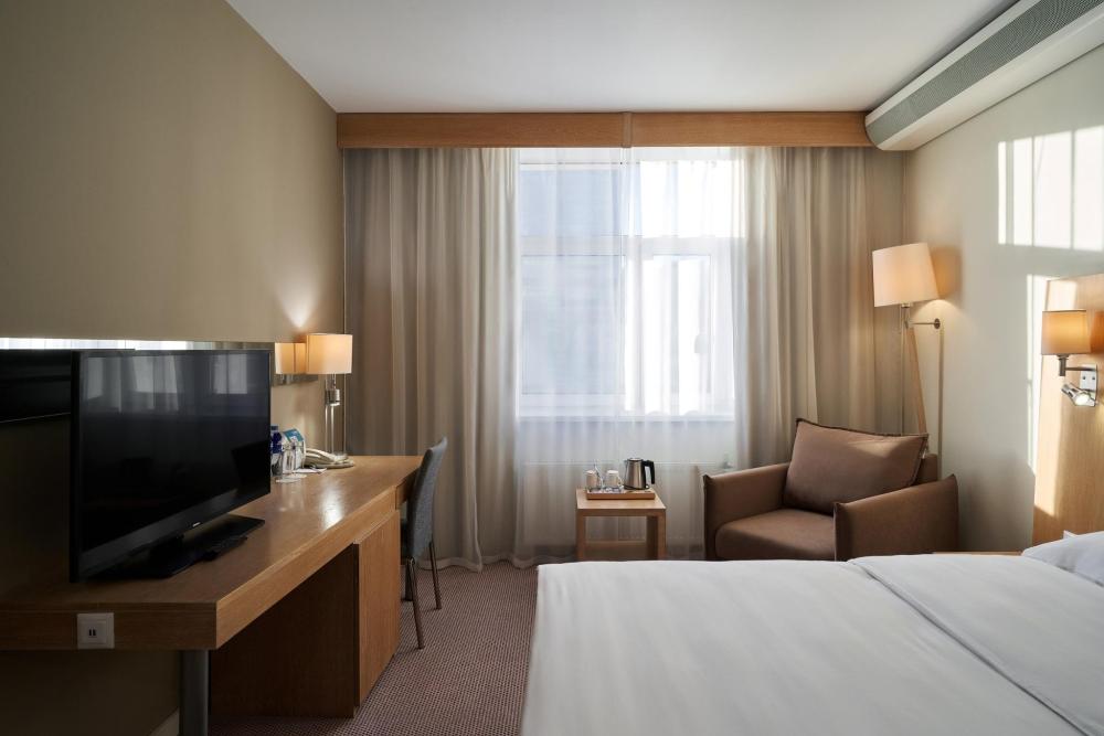 В номере: двуспальная кровать, два кресла, рабочий и журнальный столы, стул, шкаф для одежды, индивидуальный сейф, спутниковое ТВ, телефон, бесплатный беспроводной Интернет, центральная система кондиционирования воздуха. Санузел совмещен с душевой кабиной и оборудован сантехникой импортного производства.